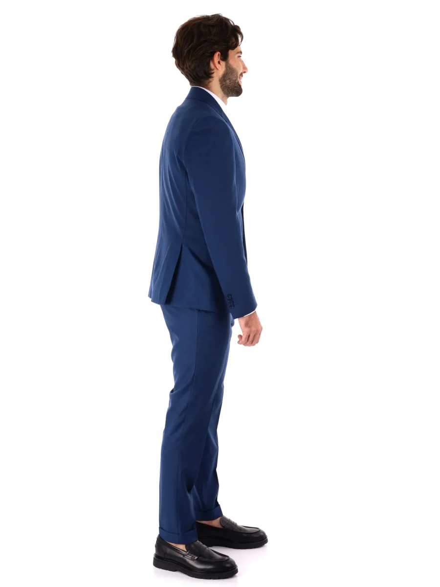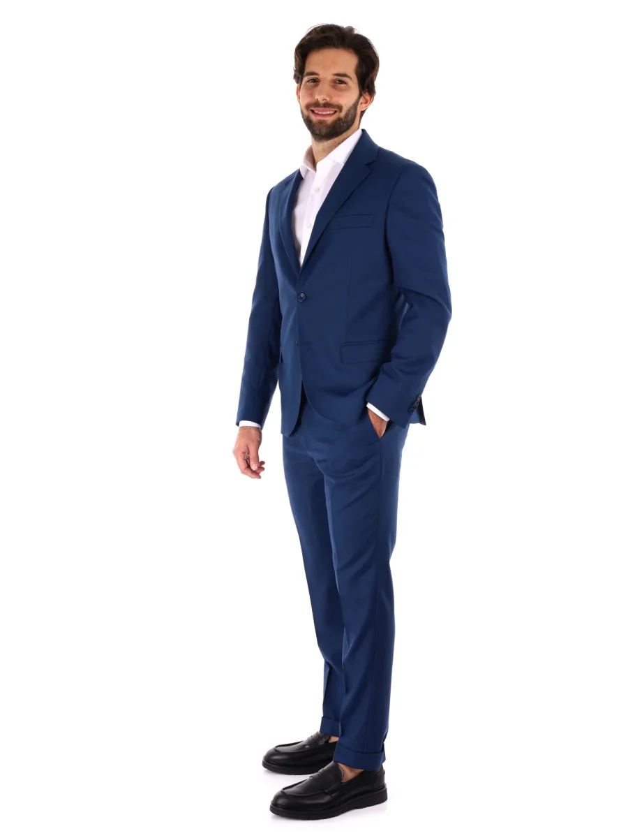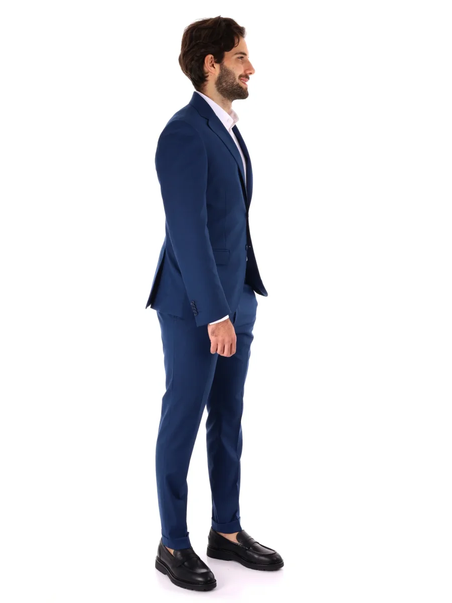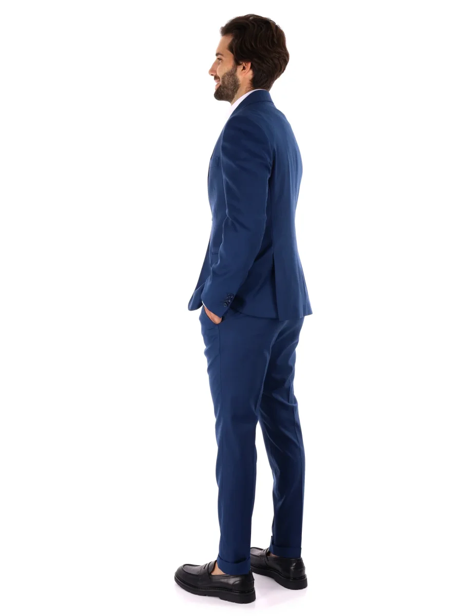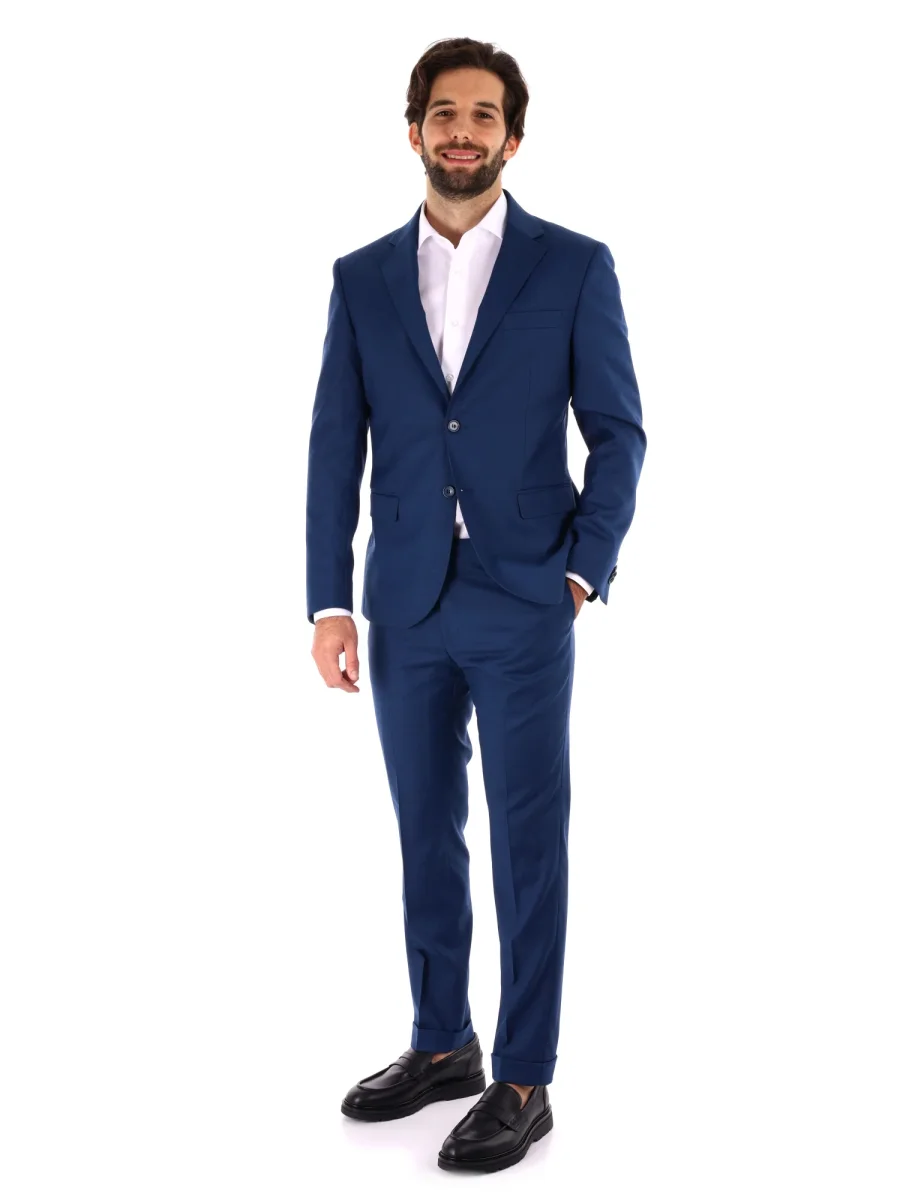 Il pantalone slim fit, dallo stile aderente e moderno, è dotato di tasche anteriori e posteriori con bottone, risvoltini eleganti, passanti in vita e chiusura con bottone e zip. Realizzato con lo stesso tessuto della giacca, assicura elasticità e comodità durante tutta la giornata.