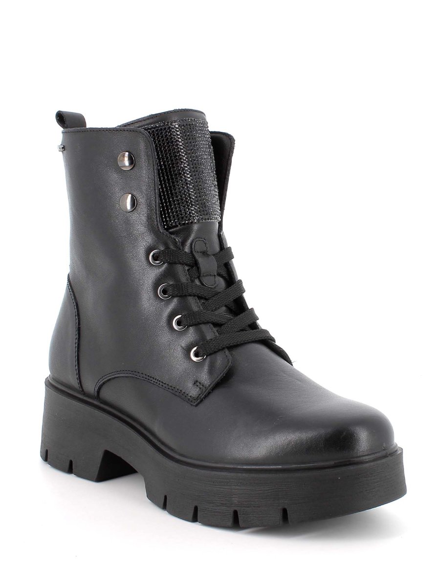 La doppia apertura con zip e lacci garantisce praticità e una calzata regolabile, mentre la suola carrarmato assicura aderenza e stabilità su ogni terreno. A impreziosire il design, la linguetta decorata con strass applicati, che aggiunge un tocco luminoso e sofisticato al look.