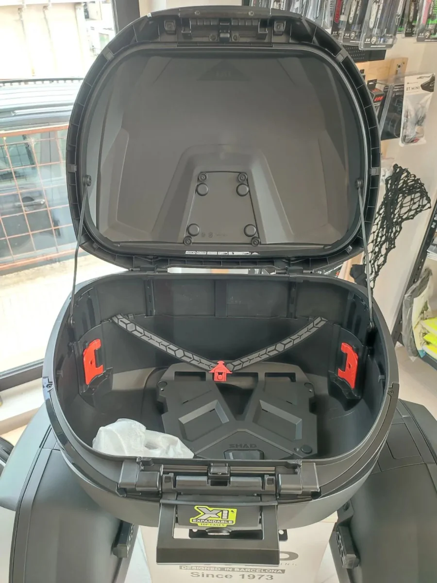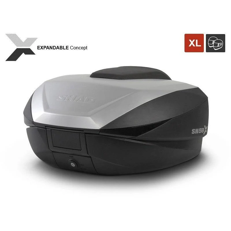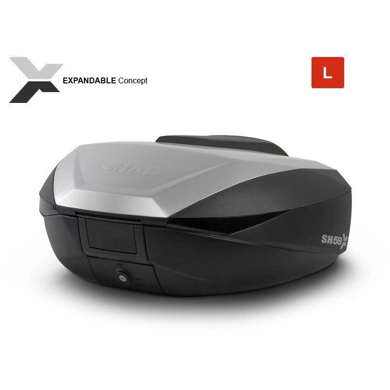 l bauletto per moto SH59X eXpandible è una valigia moto unica sul mercato. Il suo design innovativo consente di regolare il volume del carico in massimo 3 posizioni in pochi secondi (L, XL e XXL). Con la sua esclusiva finitura in alluminio, è perfetto per combinare strada e Trail Adventure.ha la capacitá per 2 caschi enduro, oltre ad accessori da viaggio.