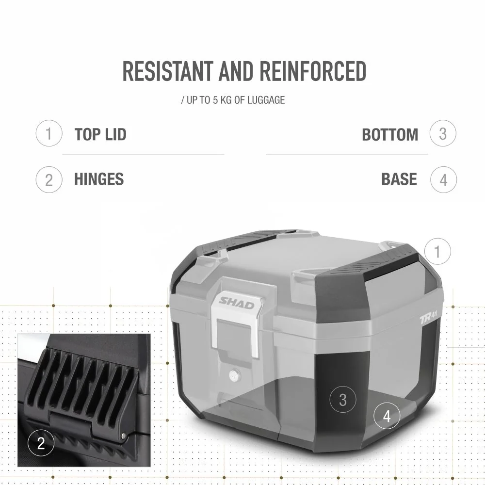 La valigia TERRA TR41 ha una capacità per 2 caschi JET e può trasportare un carico massimo di 5 kg. Realizzata in polipropilene rinforzato, offre una resistenza superiore con un peso minimo.. Progettata al 100% a Barcellona, ha una struttura pensata per resistere. Il suo telaio sigillato protegge il bagaglio da pioggia e polvere. Include attacchi superiori per carico extra e una chiusura in acciaio inox che garantisce la massima sicurezza. La TR41 è una valigia versatile, adatta sia per strada che per pista.