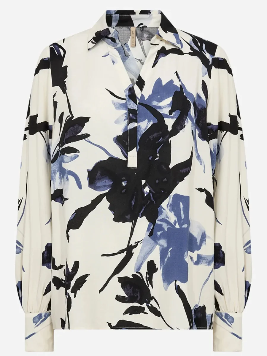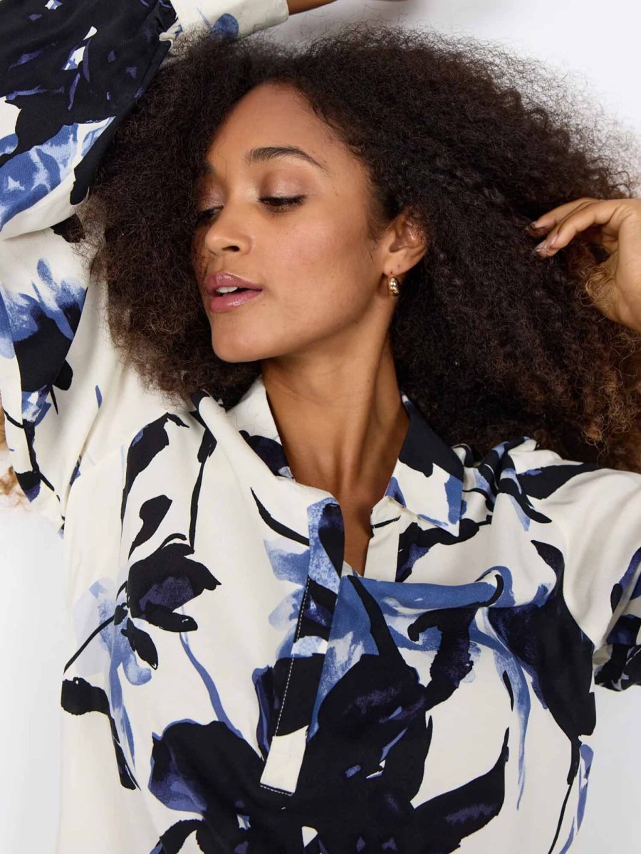 Realizzata al 100% in viscosa LENZING™ ECOVERO™, offre morbidezza, leggerezza e sostenibilità ambientale. Il modello presenta un colletto classico, uno scollo che unisce armoniosamente il rotondo a una leggera forma a V e una vivace stampa floreale, che dona freschezza e carattere al look.