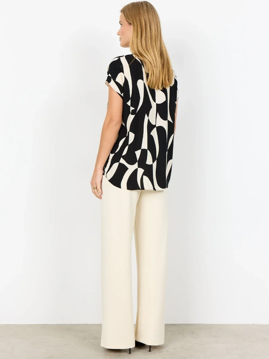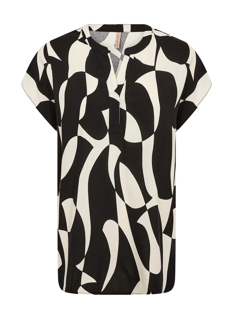 La blusa nero-bianco da donna Soya Concept, della collezione primavera/estate, è un capo elegante e sostenibile, realizzato al 100% in viscosa LENZING™ ECOVERO™. Presenta un moderno scollo a V con un bottone nascosto e una stampa astratta accattivante, che dona carattere e stile a ogni outfit.