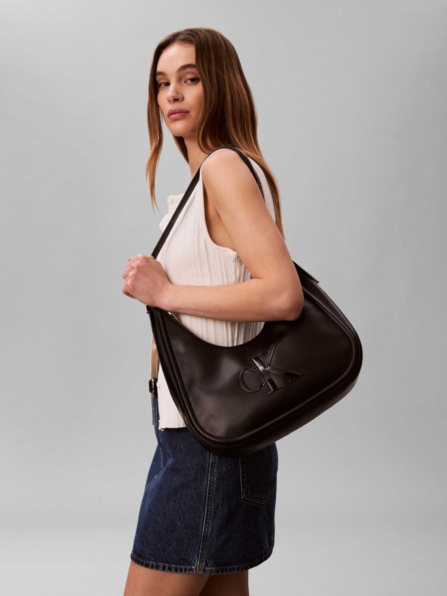 Realizzata in ecopelle liscia e morbida al tatto, si distingue per il monogramma CK in rilievo sul davanti, dettaglio distintivo che aggiunge un tocco moderno e riconoscibile. La forma hobo, morbida e avvolgente, la rende perfetta per accompagnare con naturalezza i look quotidiani.