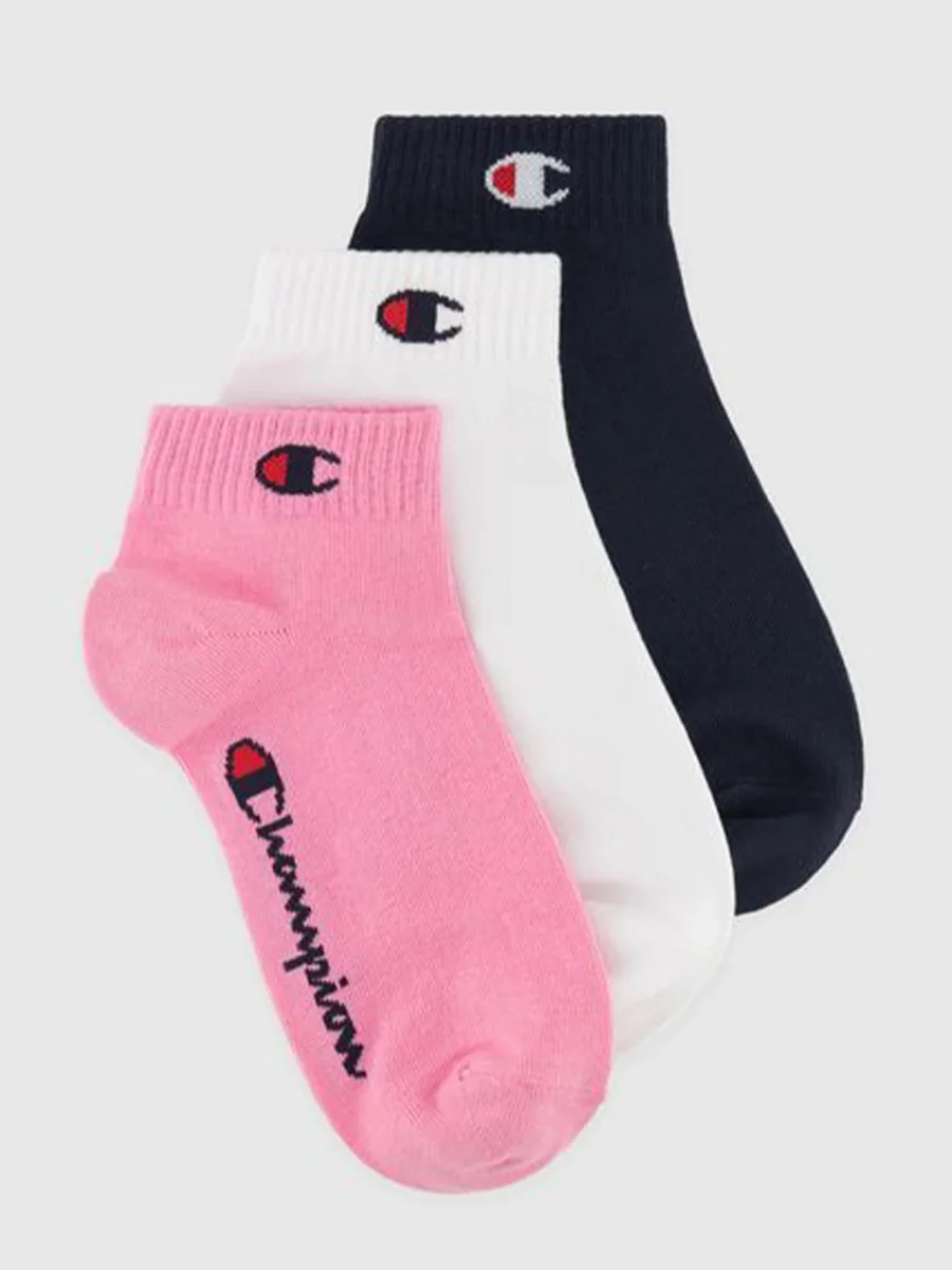 Comodo modello unisex sopra la caviglia Champion, realizzato in morbido cotone, si distingue per l’iconico logo sulla caviglia e sulla pianta del piede. Confezione composta da tre paia di calzini di colore bianco, nero e rosa.