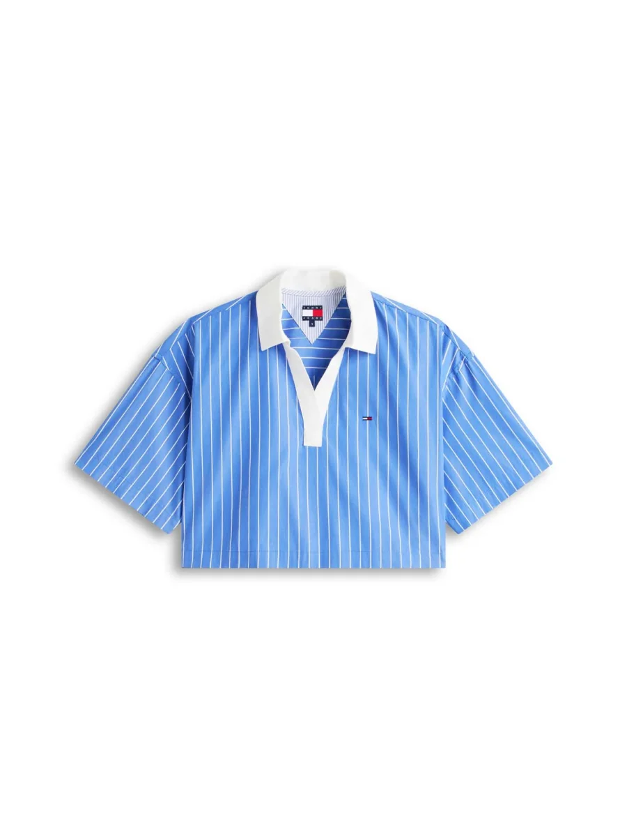 La camicia azzurra popover a maniche corte da donna di Tommy Jeans è un capo fresco e versatile, perfetto per la collezione primavera/estate. Realizzata in popeline di puro cotone, offre leggerezza e traspirabilità, garantendo comfort anche nelle giornate più calde. Il design presenta un colletto semifrancese con scollatura a V, uno stile moderno e raffinato, arricchito dalla bandierina Tommy ricamata sul petto e dal logo Tommy Jeans che valorizza il brand. Il dettaglio per appendere il capo sul retro aggiunge praticità senza compromettere l’estetica.