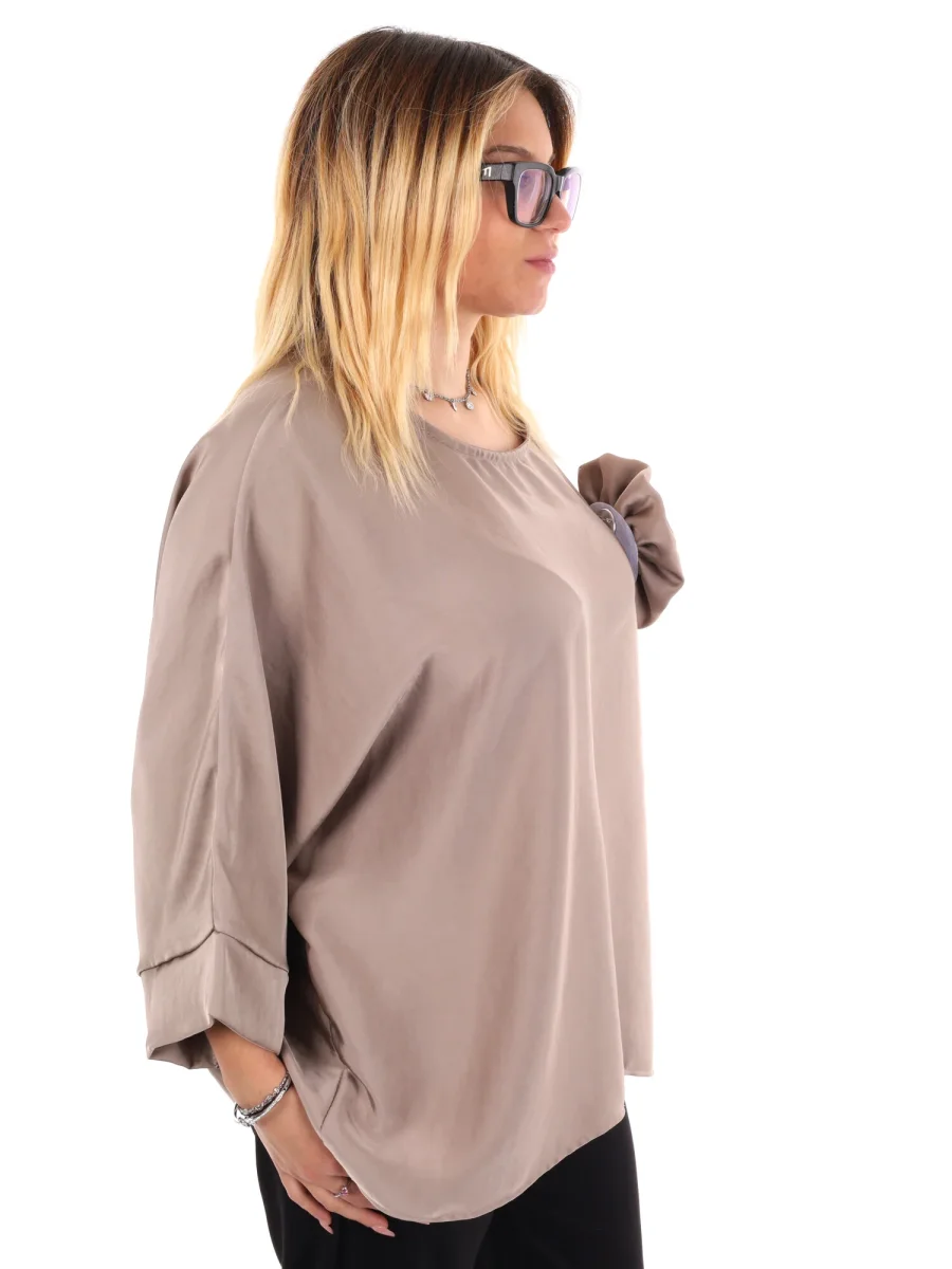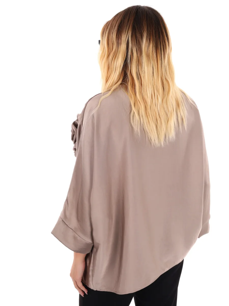 Il collo rotondo e le maniche 3/4 donano un tocco moderno e femminile, mentre il finale arrotondato e il retro più lungo creano una linea morbida e armoniosa che slancia la figura. La spilla a forma di fiore removibile aggiunge un dettaglio romantico e personalizzabile, rendendo ogni look unico.