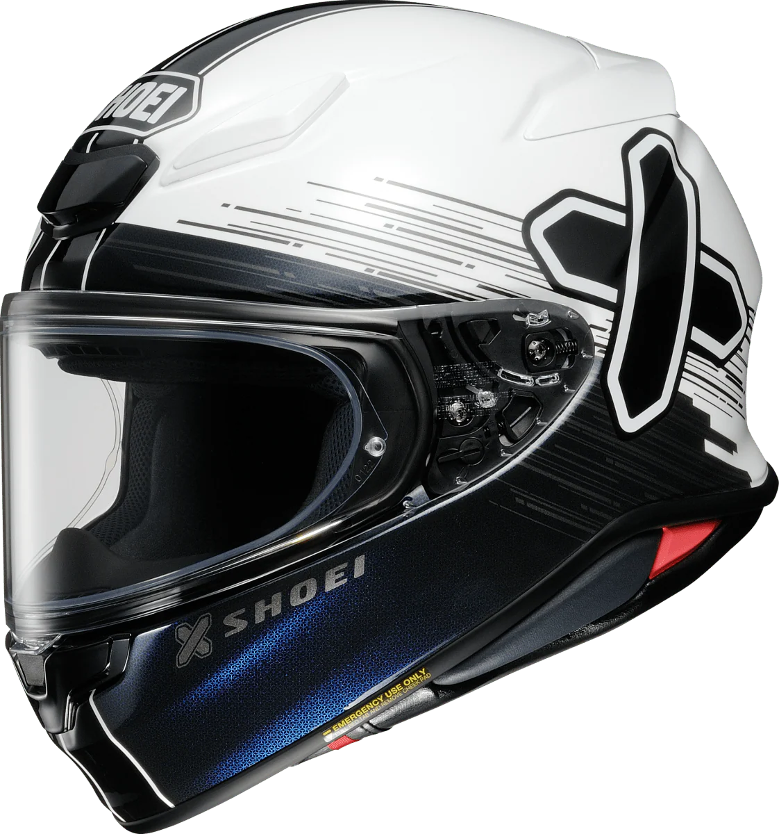 - La visiera dispone di un’elevata rigidità e stabilità alle estremità superiori e inferiori grazie al nuovo meccanismo di blocco della visiera, che riduce il rischio di apertura accidentale durante la guida ad alta velocità. La nuova leva di blocco della visiera si trova al centro della visiera e la sensazione di apertura e chiusura della visiera è più fluida e maneggevole. Il meccanismo di blocco della visiera situato al centro della presa d’aria inferiore supporta l’estremità inferiore del centro della visiera, abbassandolo si blocca e premendo il pulsante di sblocco lo rilascia.