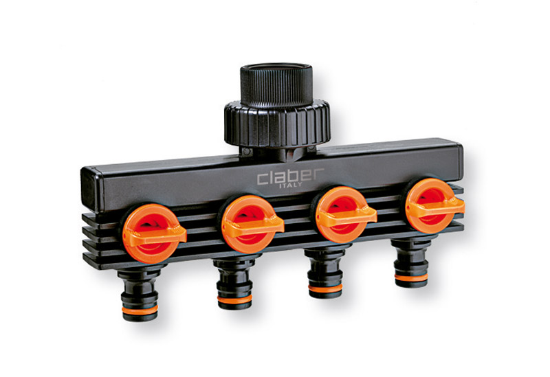 In polipropilene, per rubinetti con filetto da 3/4??, consenteNLl?allacciamento di 4 linee ad un?unica presa d?acqua,NLogni linea ? comandata in modo indipendente dal proprioNLrubinetto.