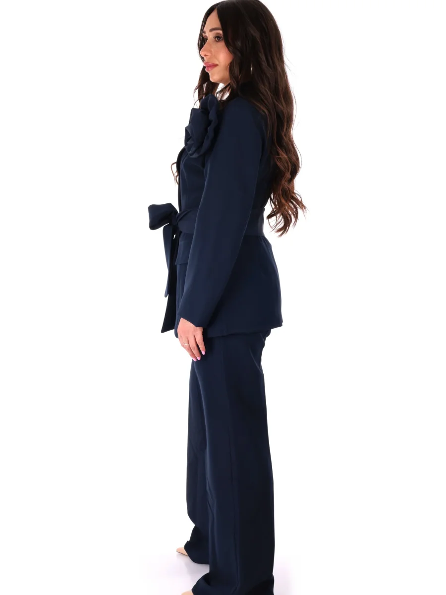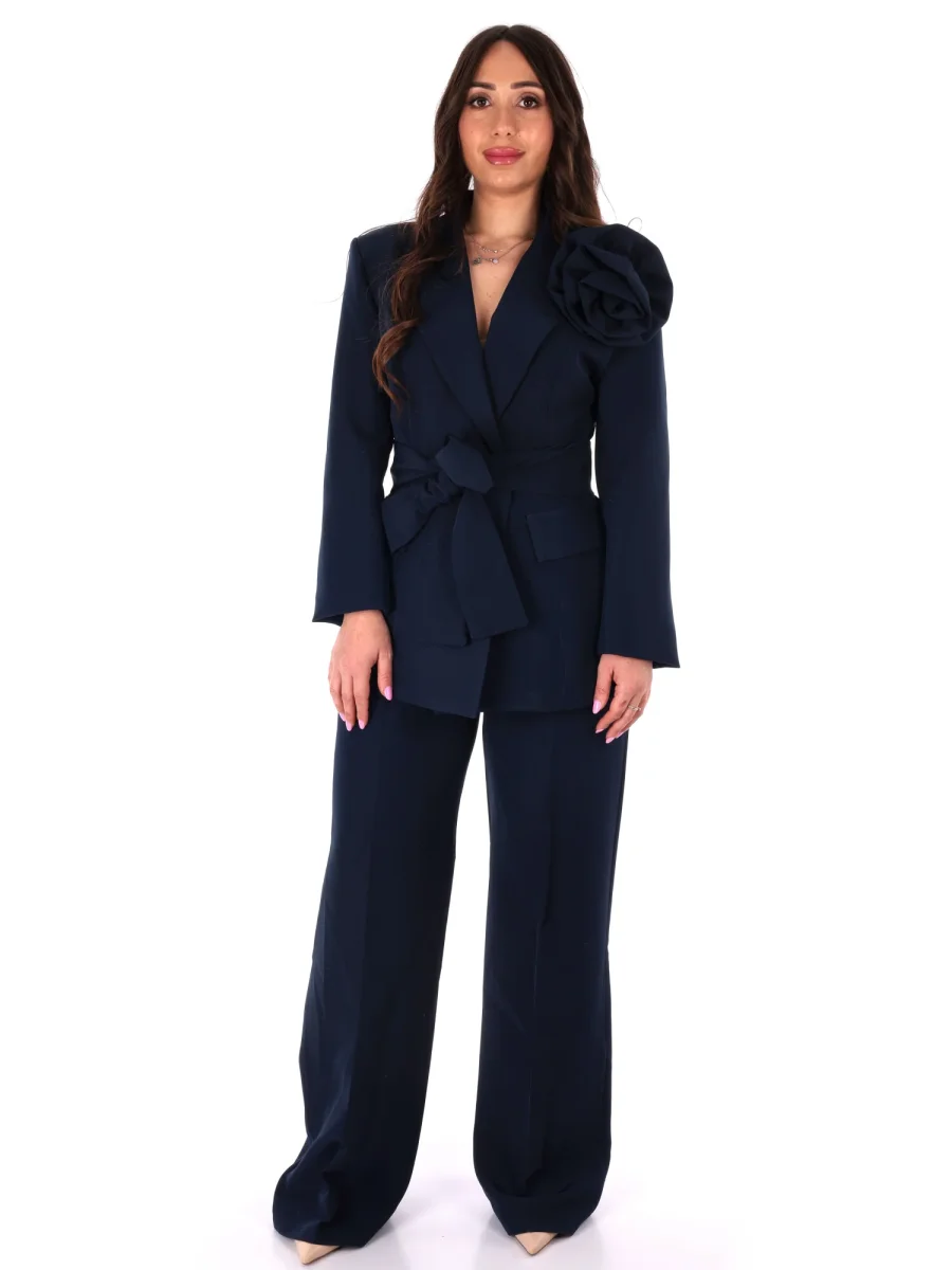 Tailleur da donna della nuova collezione Primavera/Estate firmato Miss Love, ideale per chi cerca uno stile raffinato e contemporaneo. Realizzato il poliestere, leggermente elasticizzato, è composto da una giacca blazer sfiancata, pensata per valorizzare la figura con una linea femminile e raffinata. Presenta rever classico e chiusura monobottone, arricchita da tasche finte che mantengono il design pulito ed essenziale. A renderla unica è la spilla con maxi fiore, dettaglio glamour e distintivo, abbinata a una cintura in tessuto da annodare in vita per enfatizzare ulteriormente la silhouette. La giacca è priva di passanti, per un effetto più lineare e sofisticato.