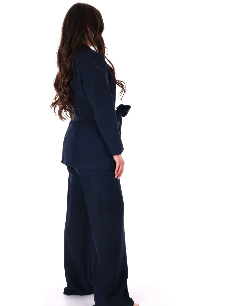 Il pantalone completa il completo con uno stile moderno e confortevole: modello wide leg, caratterizzato da pinces anteriori che donano struttura e movimento. La chiusura con bottone e zip garantisce praticità, mentre l’elastico presente solo sul retro assicura una vestibilità comoda e adattabile. Le due tasche anteriori aggiungono funzionalità senza rinunciare all’eleganza.