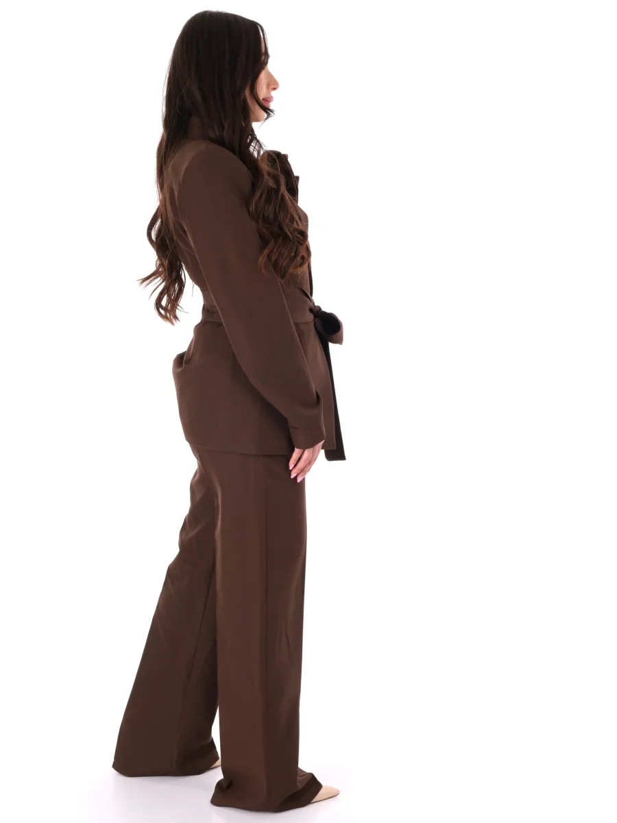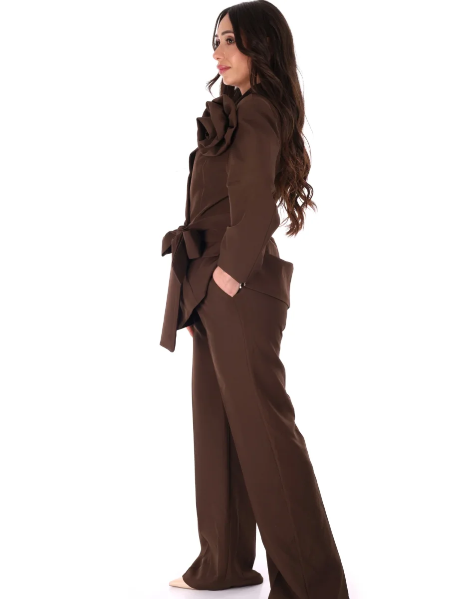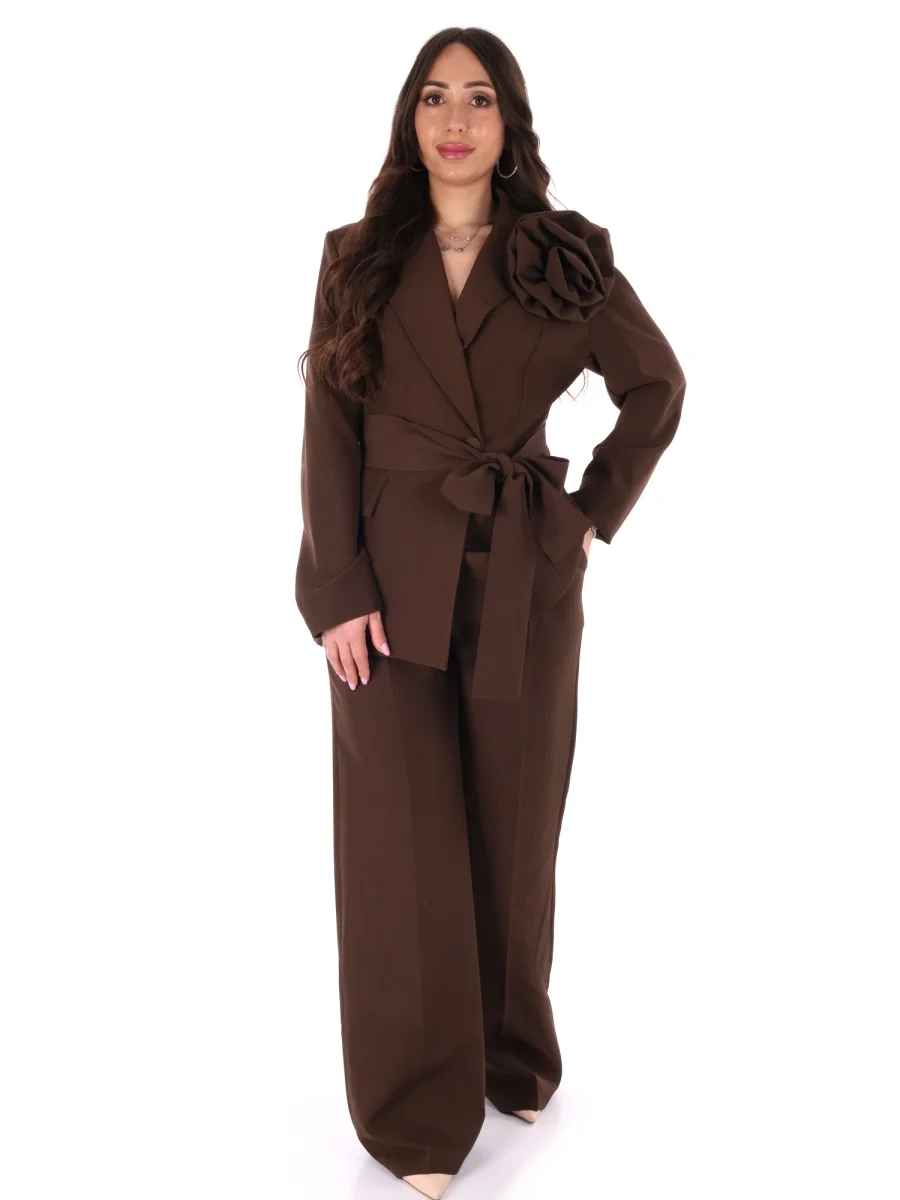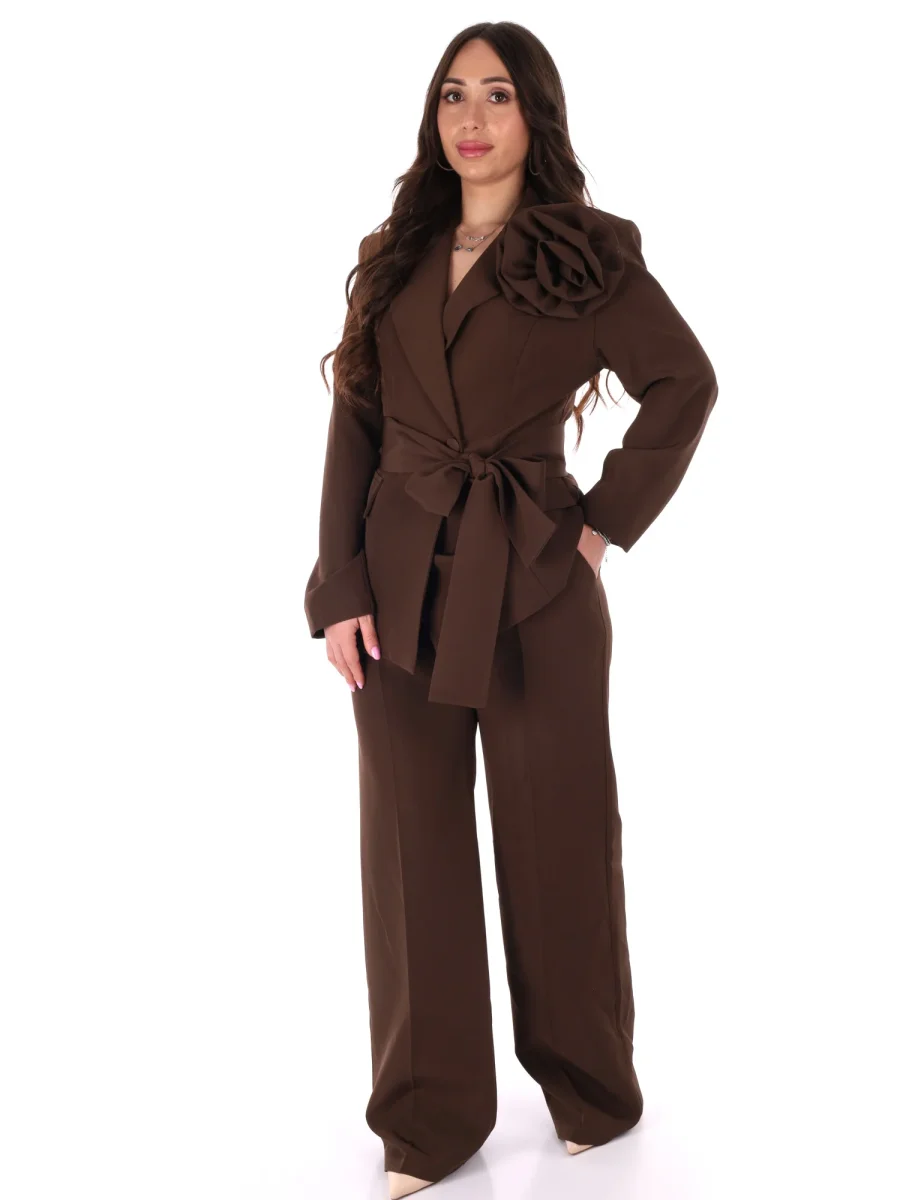 Tailleur da donna della nuova collezione Primavera/Estate firmato Miss Love, ideale per chi cerca uno stile raffinato e contemporaneo. Realizzato il poliestere, leggermente elasticizzato, è composto da una giacca blazer sfiancata, pensata per valorizzare la figura con una linea femminile e raffinata. Presenta rever classico e chiusura monobottone, arricchita da tasche finte che mantengono il design pulito ed essenziale. A renderla unica è la spilla con maxi fiore, dettaglio glamour e distintivo, abbinata a una cintura in tessuto da annodare in vita per enfatizzare ulteriormente la silhouette. La giacca è priva di passanti, per un effetto più lineare e sofisticato.