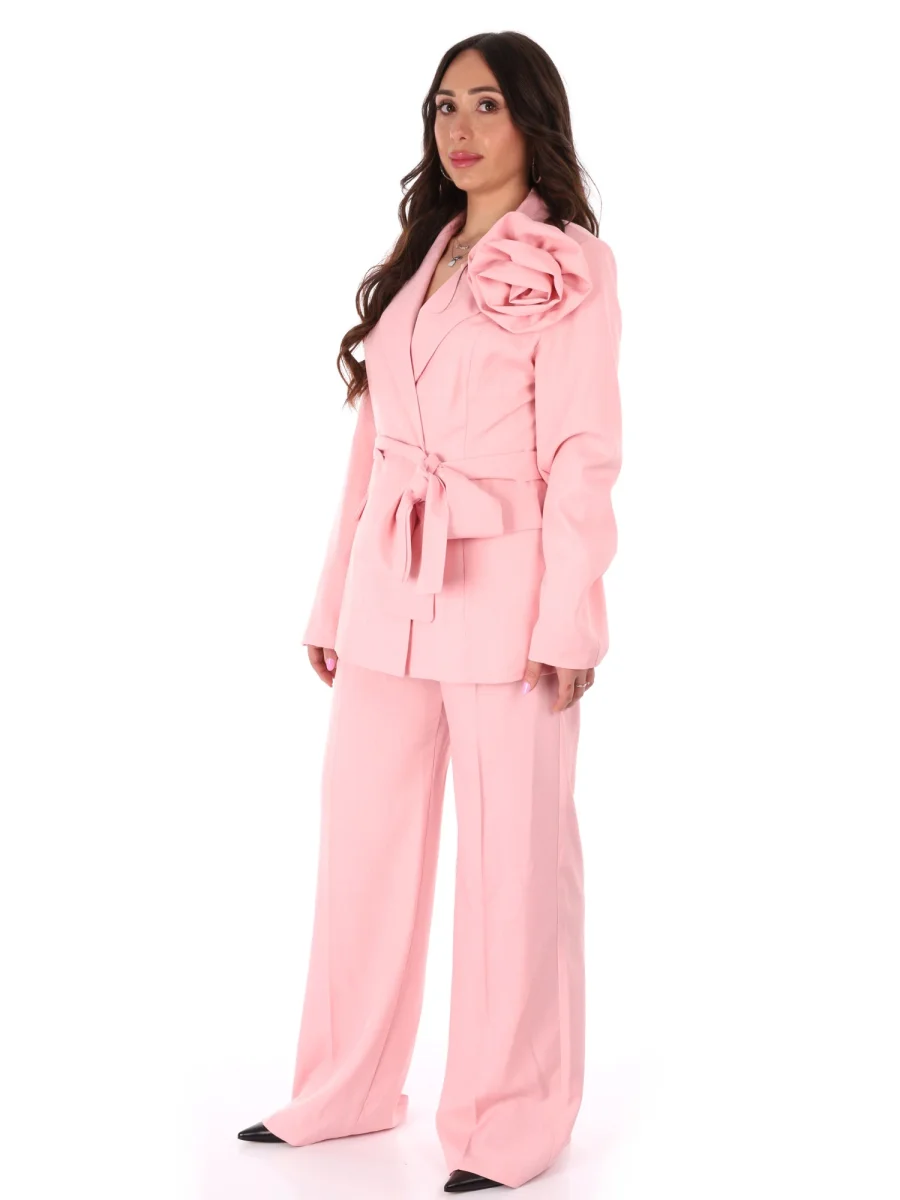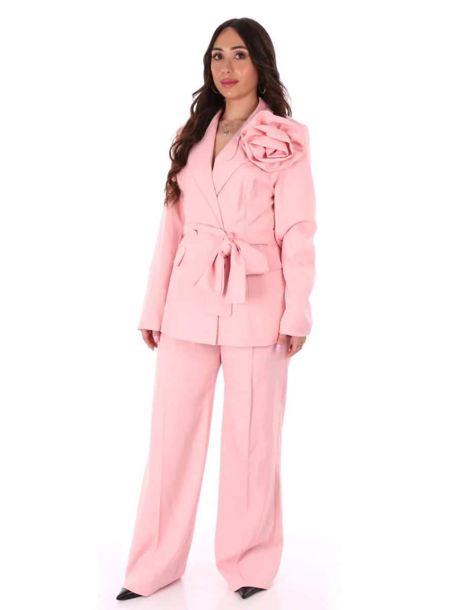 Tailleur da donna della nuova collezione Primavera/Estate firmato Miss Love, ideale per chi cerca uno stile raffinato e contemporaneo. Realizzato il poliestere, leggermente elasticizzato, è composto da una giacca blazer sfiancata, pensata per valorizzare la figura con una linea femminile e raffinata. Presenta rever classico e chiusura monobottone, arricchita da tasche finte che mantengono il design pulito ed essenziale. A renderla unica è la spilla con maxi fiore, dettaglio glamour e distintivo, abbinata a una cintura in tessuto da annodare in vita per enfatizzare ulteriormente la silhouette. La giacca è priva di passanti, per un effetto più lineare e sofisticato.