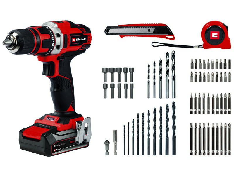 Tensione 18 V, mandrino autoserrante mm. 13, regolazione elettronica, 2 velocita’, 21 posizioni, reversibile, luce a led integrata, impugnatura antiscivolo. In dotazione: valigetta, batteria al litio da 2,5 Ah Power X-Change, caricabatteria rapido, set accessori 69 pezzi.NLNLForza di torsione (Nm) 40NLN. giri a vuoto (g/min) 0-400/1.500NLPeso (kg) 1,06