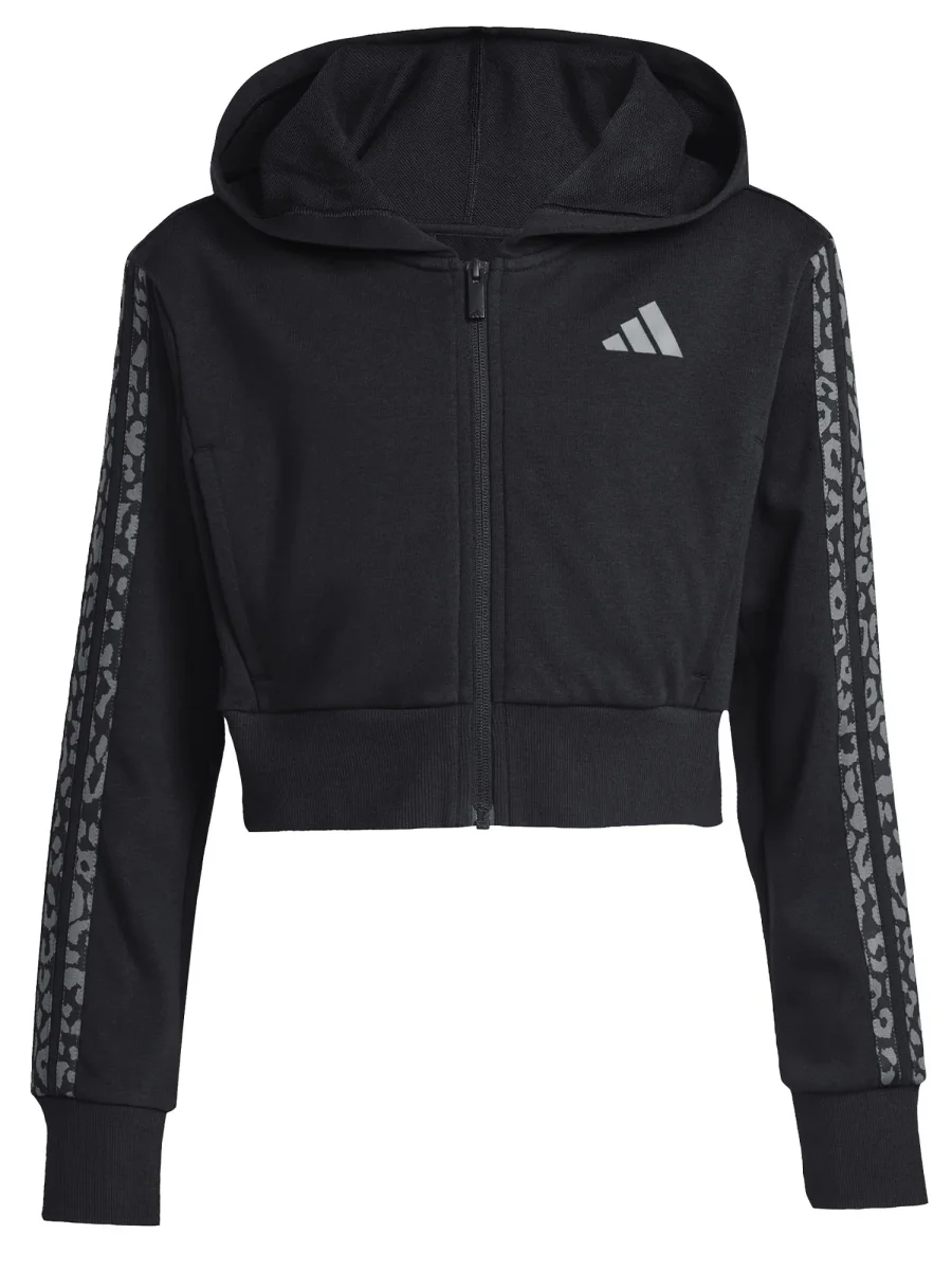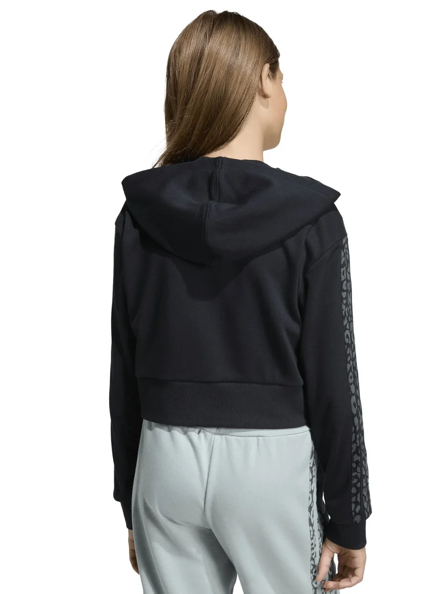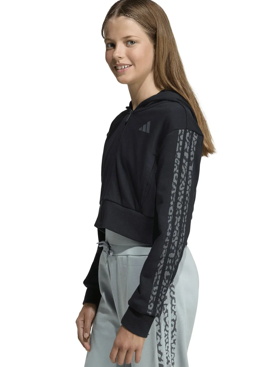 La felpa Adidas per bambina unisce stile, comfort e funzionalità in un capo perfetto per la stagione primavera/estate. Realizzata in tessuto morbido e traspirante, assicura libertà di movimento e comfort durante le attività quotidiane o sportive. Il design cropped con cappuccio regala un look moderno e dinamico, mentre la chiusura con zip integrale permette di indossarla e toglierla con facilità. Le iconiche tre strisce laterali leopardate tono su tono e il logo frontale aggiungono un tocco distintivo e originale, rendendo il capo immediatamente riconoscibile come Adidas.