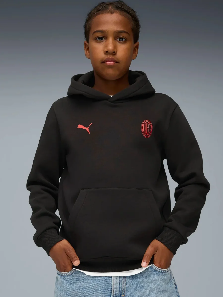 Dalla collezione autunno/inverno AC Milan 25/26 firmata Puma da ragazzo, questa felpa con cappuccio è realizzata in cotone con almeno il 20% di materiale riciclato e interno in morbido pile. Comoda e calda, è dotata di cappuccio, tasca a marsupio, polsi e fondo a costina. Rifinita con dettagli iconici del club, è un capo essenziale per ogni giovane tifoso rossonero.