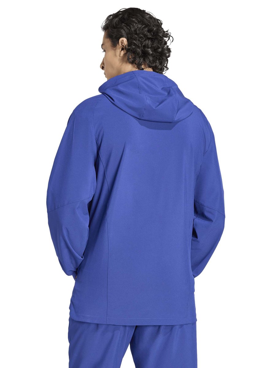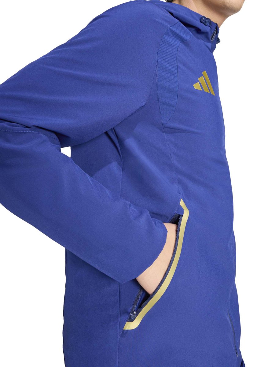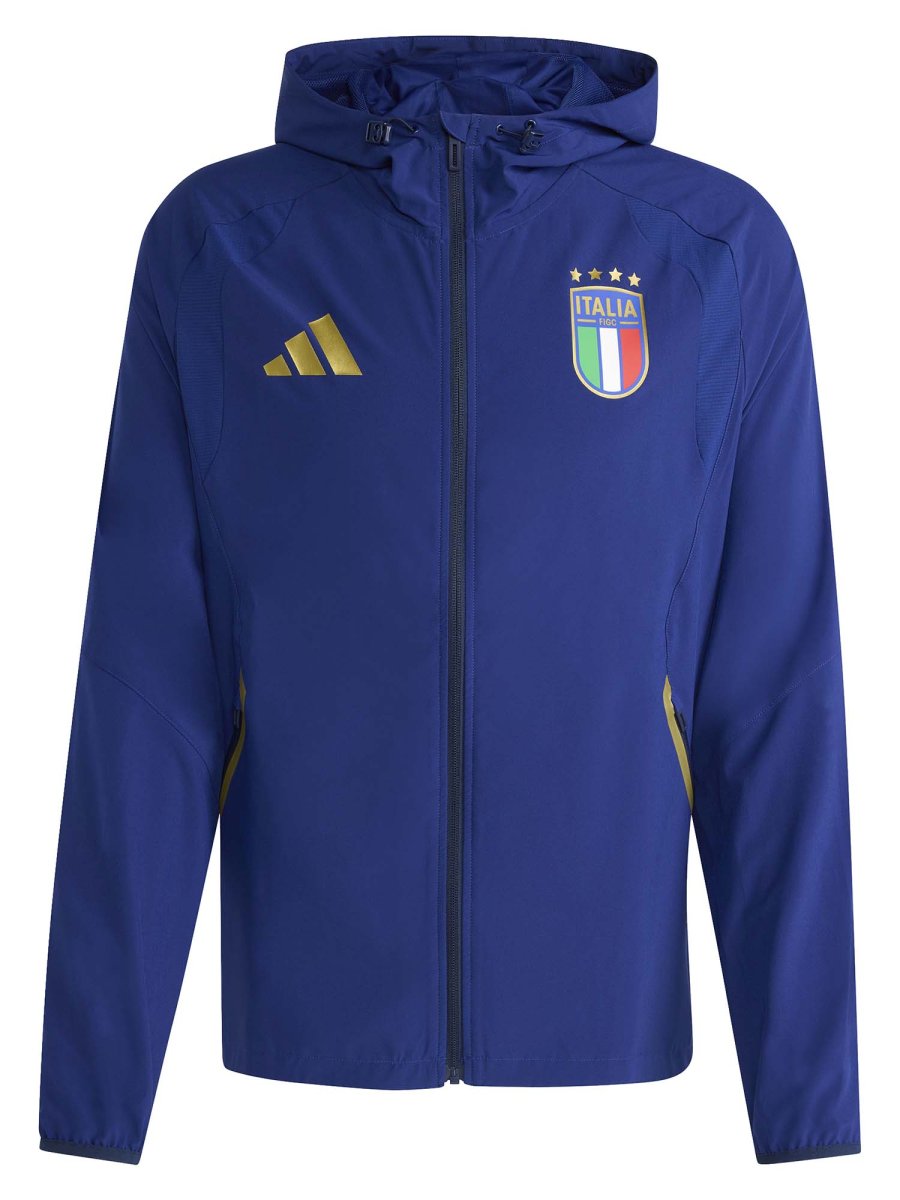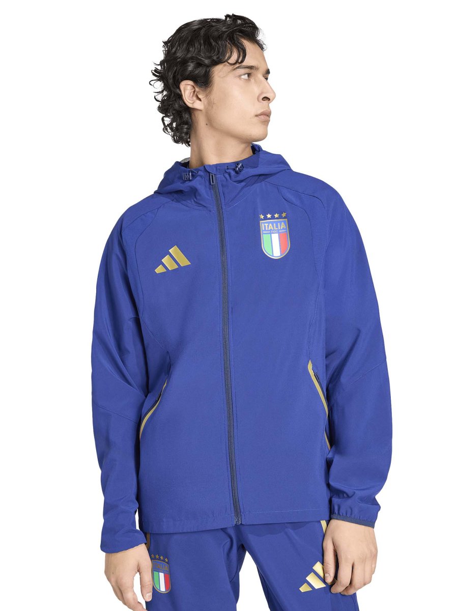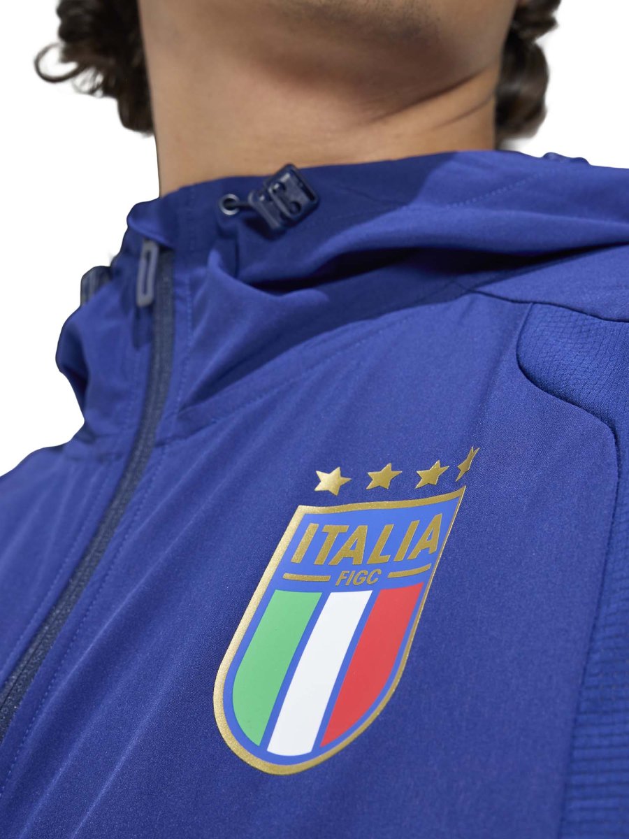 La zip frontale a tutta lunghezza facilita l’uso e consente di modulare la vestibilità secondo le esigenze, mentre il cappuccio regolabile aggiunge protezione e praticità. Il design ergonomico e il taglio regolare assicurano libertà di movimento e una silhouette moderna. Dettagli come il logo adidas Performance e l’emblema della nazionale italiana completano il look, conferendo autenticità e stile sportivo riconoscibile.