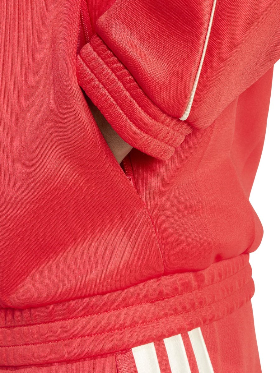 Il design si ispira alle iconiche giacche da allenamento, con zip frontale completa, colletto alto e vestibilità regular tendente al loose, che garantisce libertà di movimento e una vestibilità rilassata. Le tasche laterali con zip aggiungono praticità, permettendo di portare con sé piccoli oggetti in sicurezza.