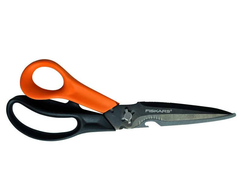 Lame rivestite in titanio (3 volte pi? resistenti dell?acciaio),NLimpugnatura ergonomica, lame sagomate separabili perNLessere usate come un coltello, funzione apribottiglia, dotatoNLdi coprilama con affilalame, in Blister