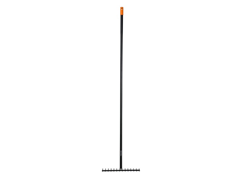 Manico in alluminio, testa in acciaio temperato, adatto perNLappianare il terreno, prepararlo per la semina, per rastrellareNLe spargere il pacciame, larghezza cm. 36, lunghezza totaleNLcm. 154.