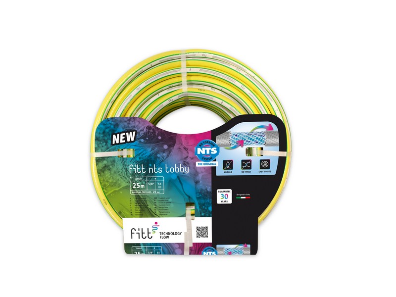 FITT NTS Tobby ? l?innovativo tubo con tecnologia NTS unicaNLed originale, per un?elevata malleabilit? senza nodi e torsioni,NLe che garantisce un flusso d?acqua costante. Resistente a pressioniNLelevate fino a 27 bar, con protezione anti-alga e conNLmateriali resistenti ai raggi-uv. Prodotto garantito 30 anni.