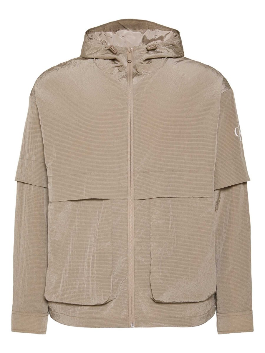 Giacca a vento da uomo Calvin Klein della collezione primavera/estate, caratterizzata da cappuccio regolabile e design contemporaneo. Il modello presenta apertura frontale con zip, tasche anteriori con bottone automatico e logo stampato sulla manica sinistra, unendo funzionalità e stile distintivo. Leggera e versatile, questa giacca è ideale per protezione dal vento e look casual moderni, perfetta come strato esterno nella mezza stagione.