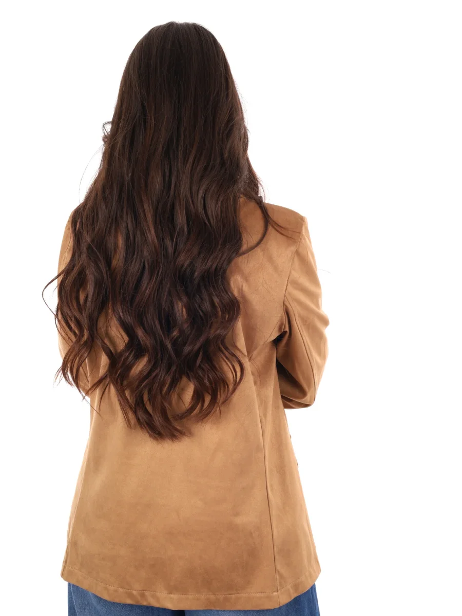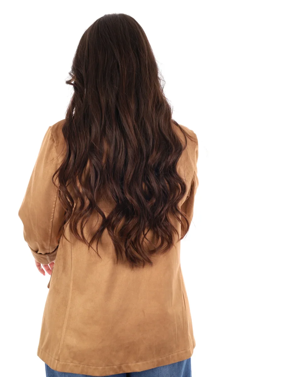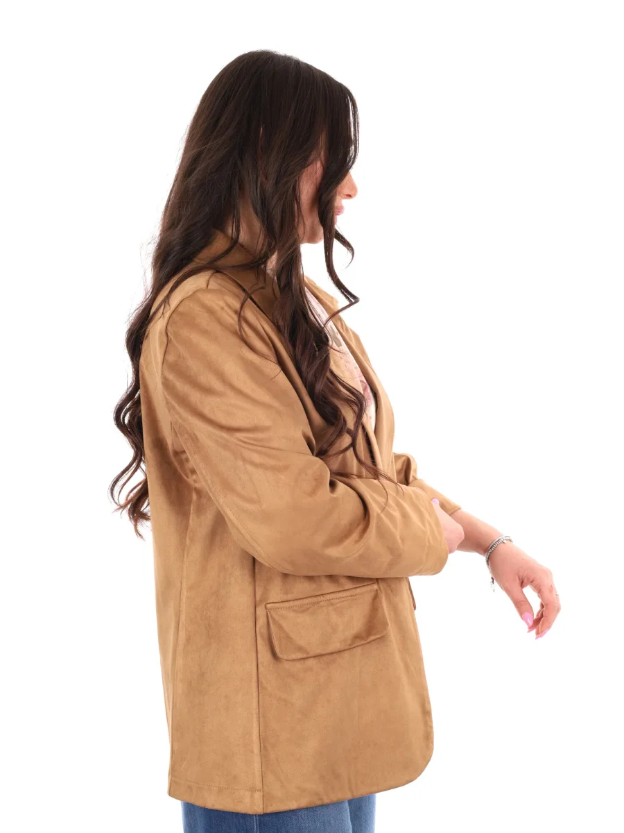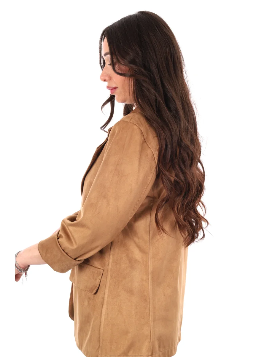 Giaccia monopetto da donna Miss Love della nuova collezione Primavera/Estate, realizzata in morbido scamosciato effetto renna per un look sofisticato e contemporaneo. La linea leggermente sfiancata valorizza la silhouette, mentre il rever classico aggiunge un tocco elegante e intramontabile.