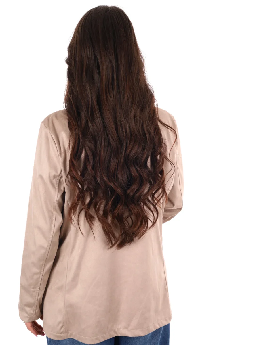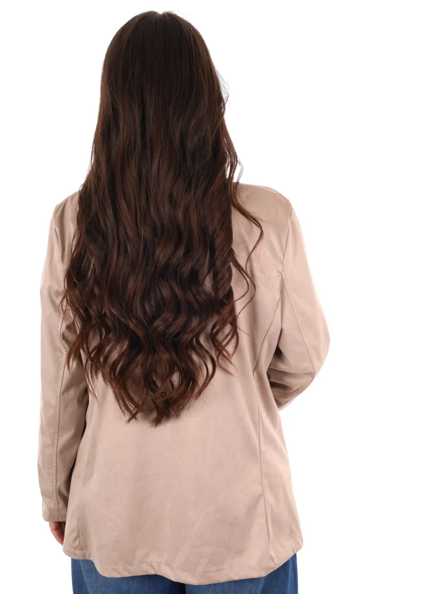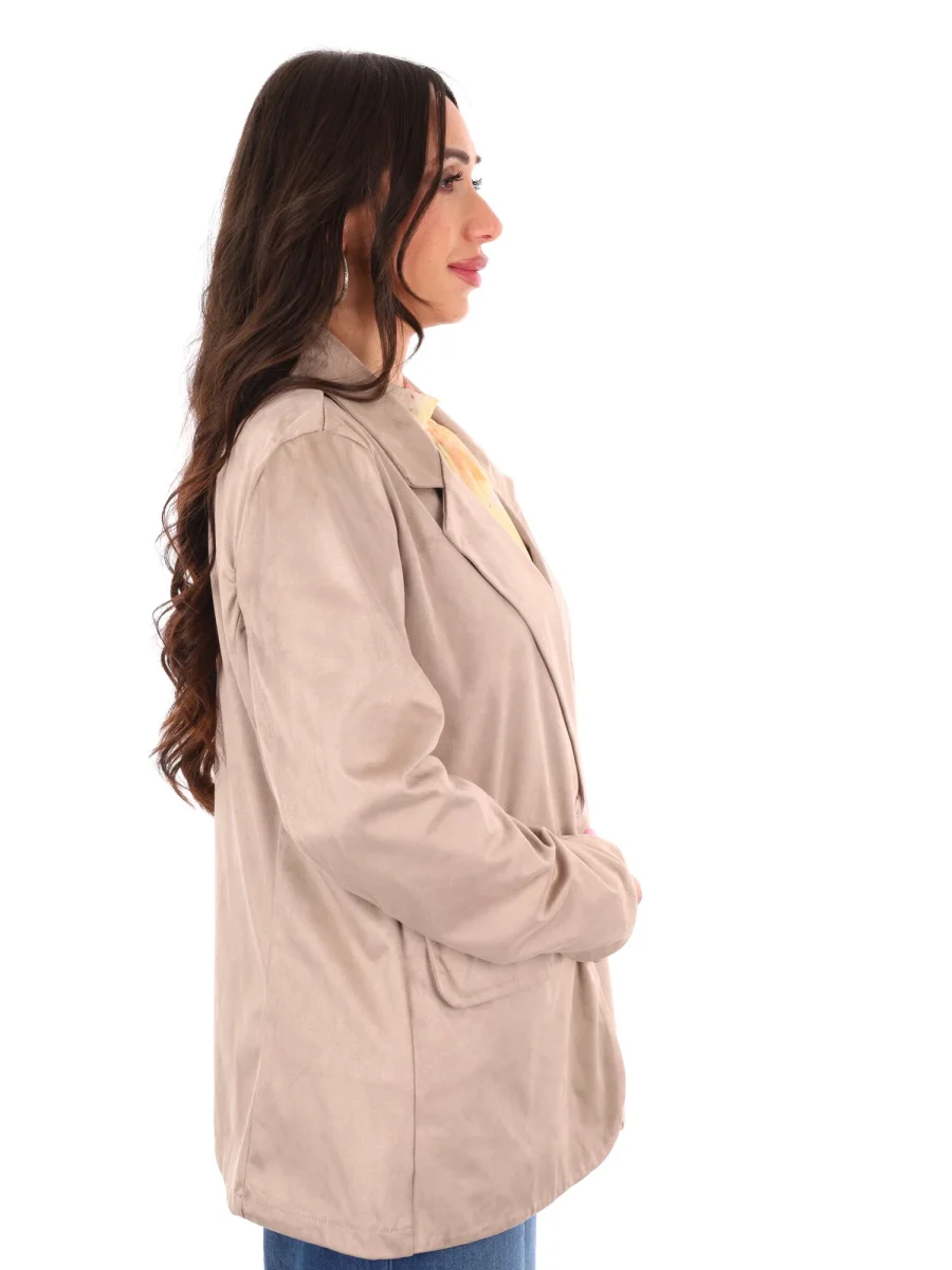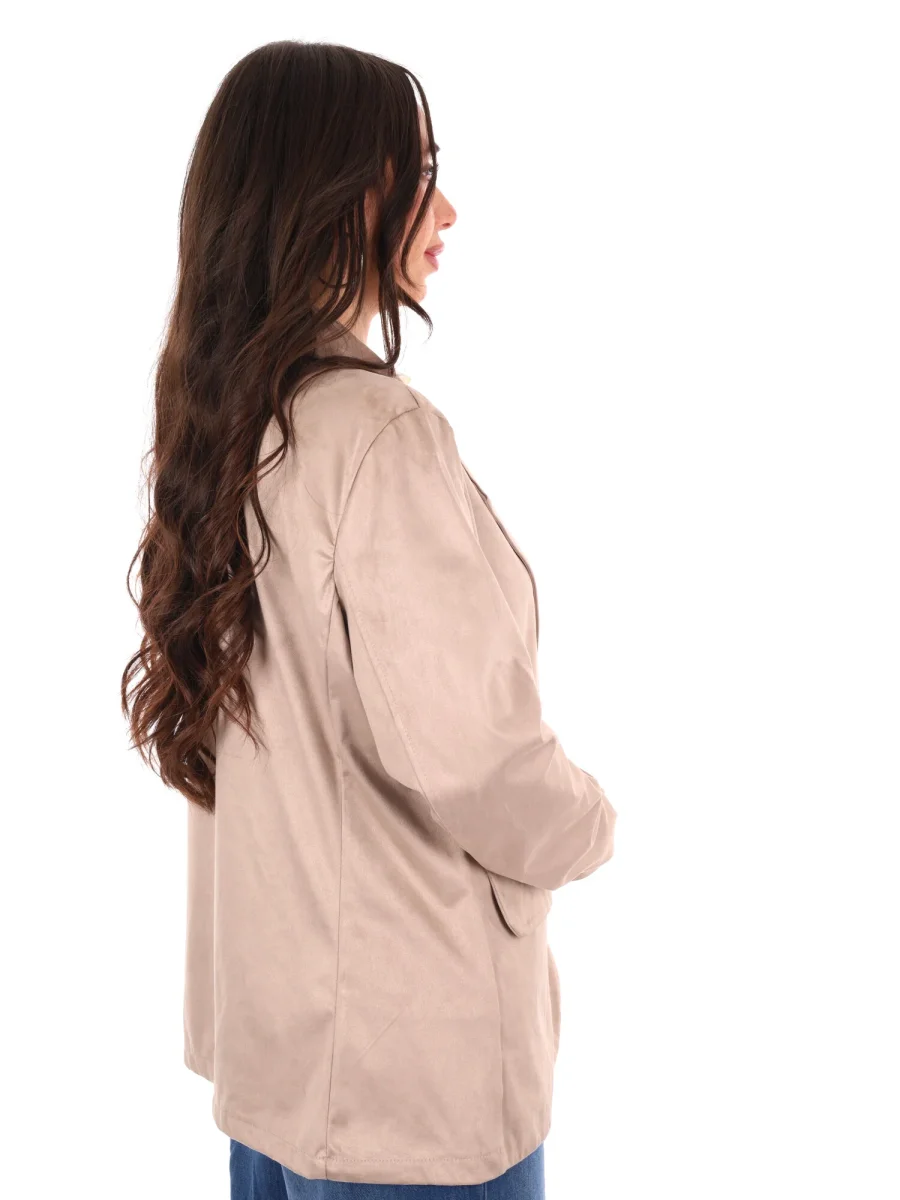 Giaccia monopetto da donna Miss Love della nuova collezione Primavera/Estate, realizzata in morbido scamosciato effetto renna per un look sofisticato e contemporaneo. La linea leggermente sfiancata valorizza la silhouette, mentre il rever classico aggiunge un tocco elegante e intramontabile.