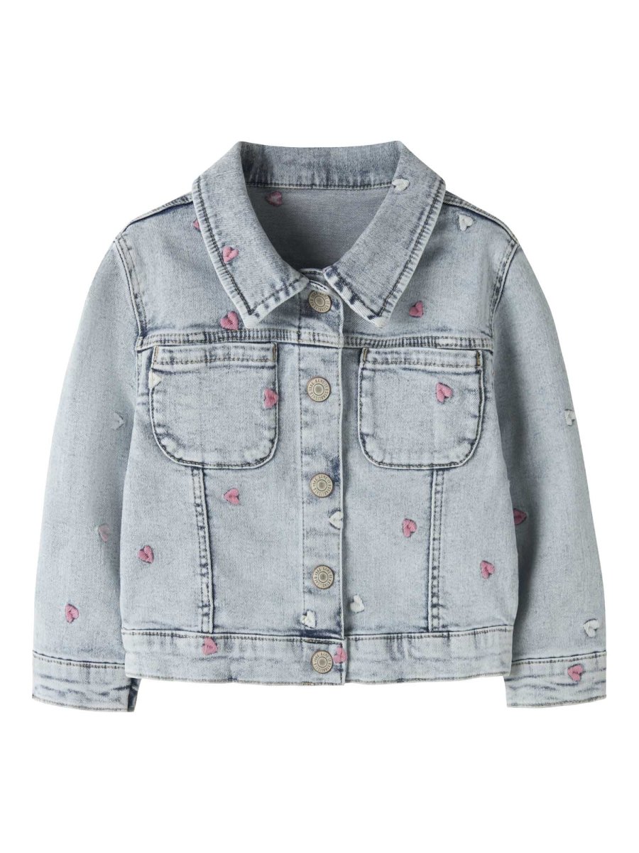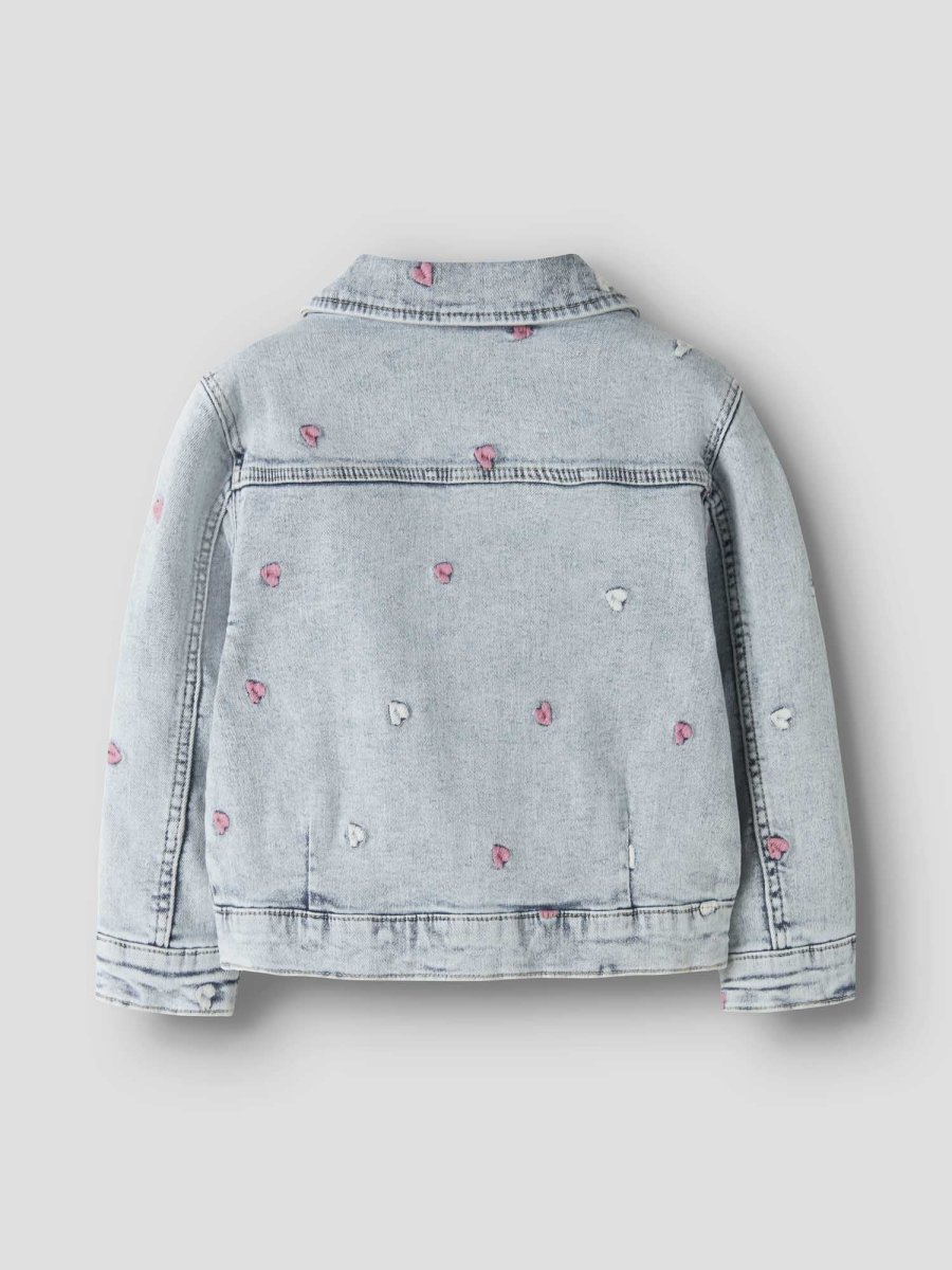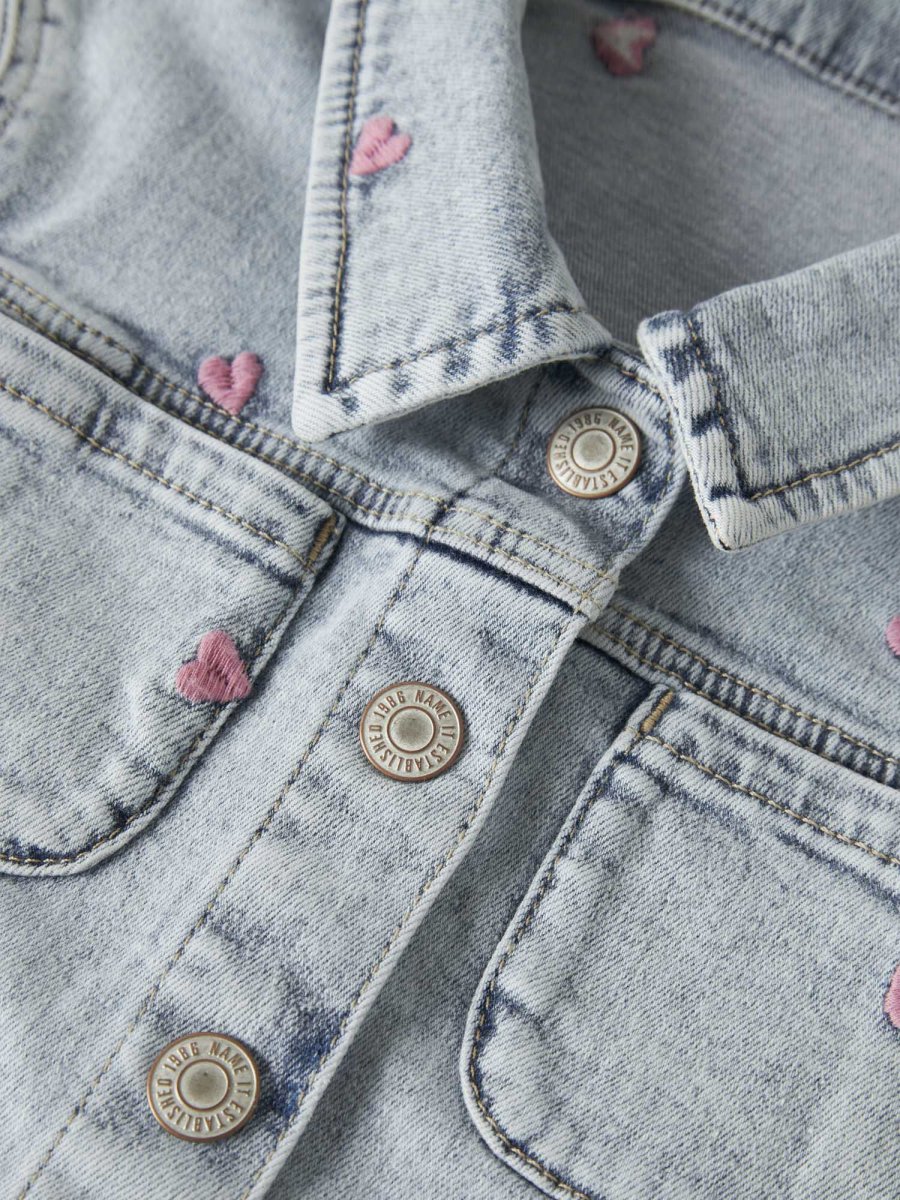Name It Nmfelisa Denim Jacket – un giubbotto in denim chiaro dal fascino casual e moderno, arricchito da delicati ricami a forma di cuore che aggiungono un tocco giocoso e unico.