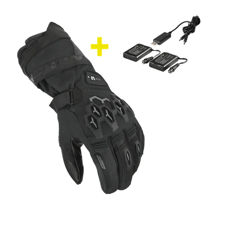 Questo prodotto contiene due batterie da 7,4 V con 2,2 A e, a seconda della data di produzione, un caricatore da parete con attacchi multipli per diverse connessioni o un cavo di ricarica USB. Se si desidera utilizzare il nostro ecosistema riscaldato flessibile e collegare un alimentatore più potente, consigliamo di acquistare i guanti e l’alimentatore separatamente.