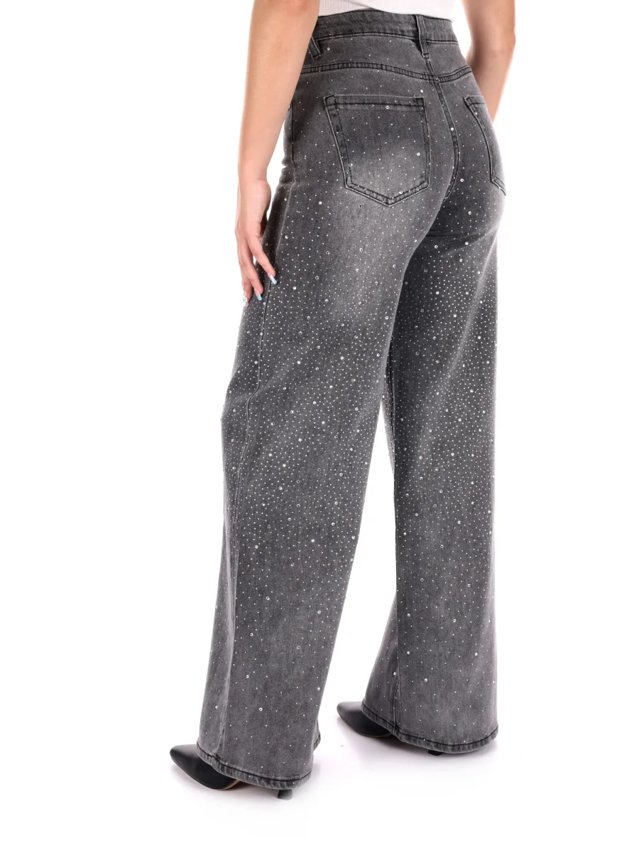 Il lavaggio grigio slavato aggiunge profondità al look, reso ancora più originale dalla presenza di micro strass applicati sul fronte e sul retro, per un effetto brillante ma mai eccessivo. I dettagli funzionali come i passanti in vita, la chiusura con bottone e zip e la classica struttura a cinque tasche completano un capo versatile, adatto sia per il giorno che per la sera.
