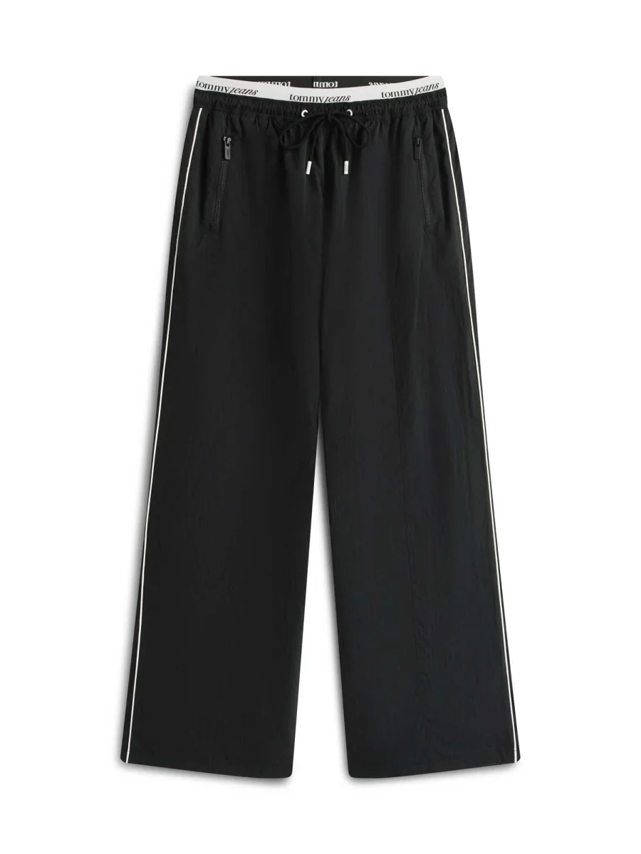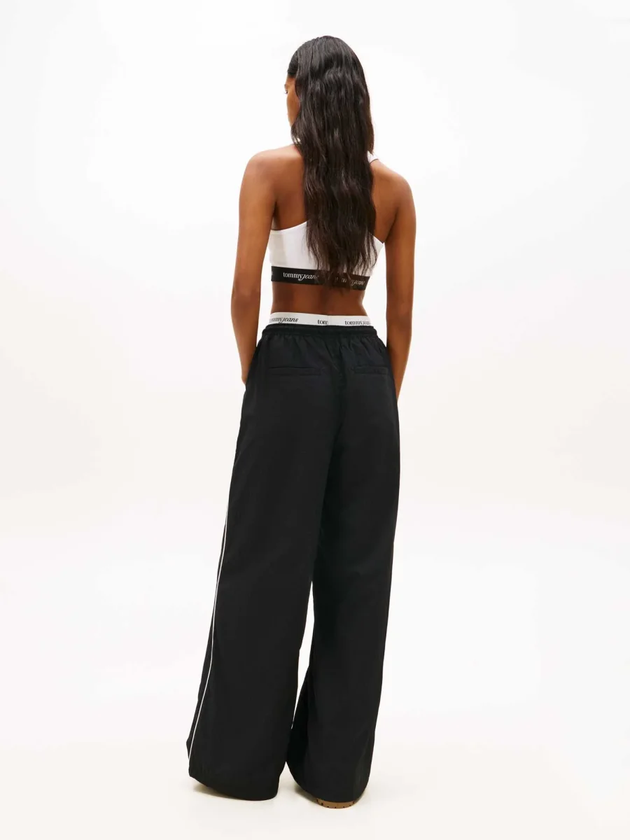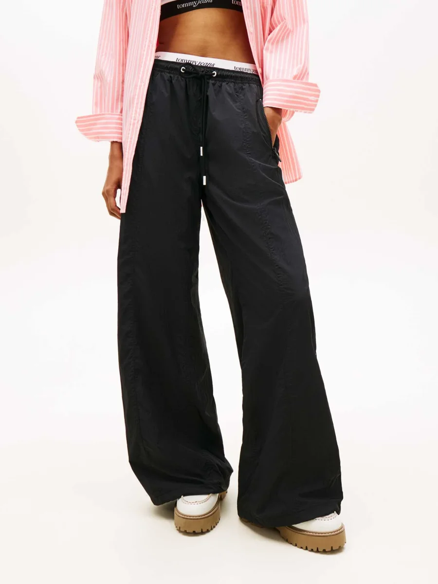 I jogger larghi neri Tommy Jeans da donna della nuova collezione Primavera/Estate combinano stile moderno e comfort in un capo versatile e pratico. Realizzati in nylon riciclato, offrono resistenza e sostenibilità, mentre la vestibilità ampia garantisce libertà di movimento e comfort per tutto il giorno.