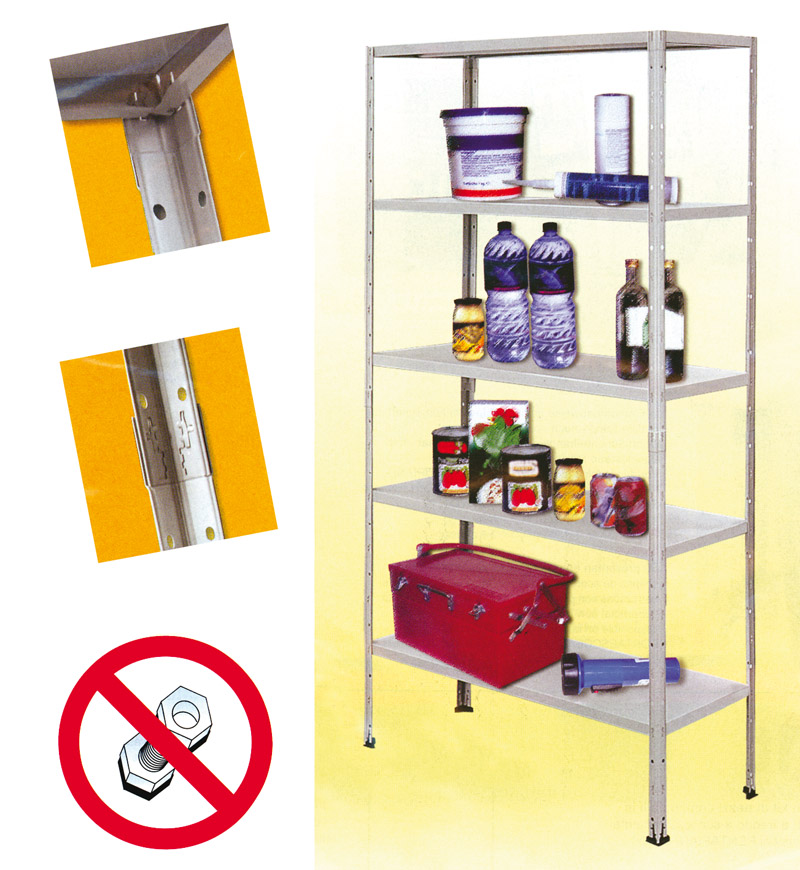 In lamiera verniciata, 5 ripiani, col. grigio, completo diNLangolari e piedini.NL