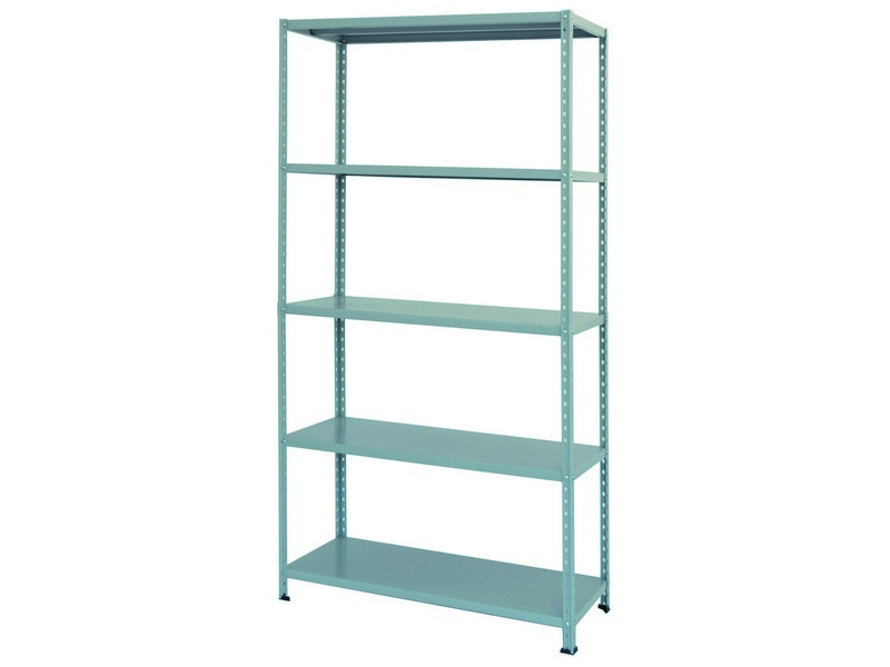 In lamiera verniciata, con rinforzo, 5 ripiani, col. grigio, completo di angolari, bulloni e piedini.NLNLAste intere (spessore mm. 1,5)NLcod. 42503 cm. 100x40x200 h cf/pz 1