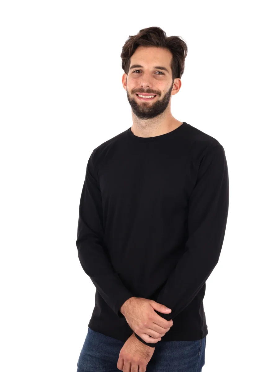 Maglia a maniche lunghe da uomo FB realizzata in cotone elasticizzato di alta qualità che assicura morbidezza, comfort e una perfetta libertà di movimento. Il design è semplice ed essenziale, con girocollo classico e vestibilità regolare, ideale per un look pulito e versatile. Un capo intramontabile del guardaroba maschile, perfetto da indossare da solo per uno stile casual oppure sotto giacche e felpe per un outfit più curato e contemporaneo.