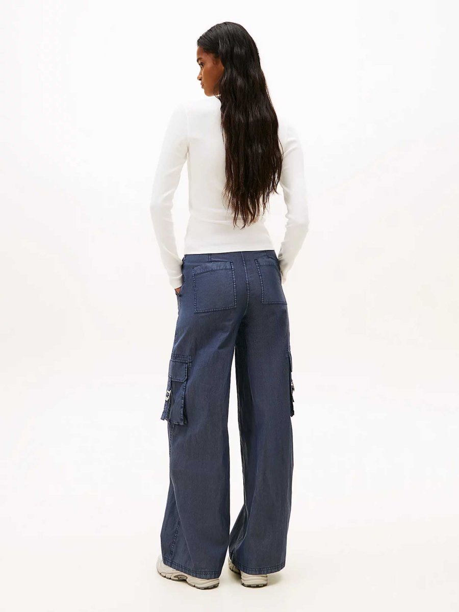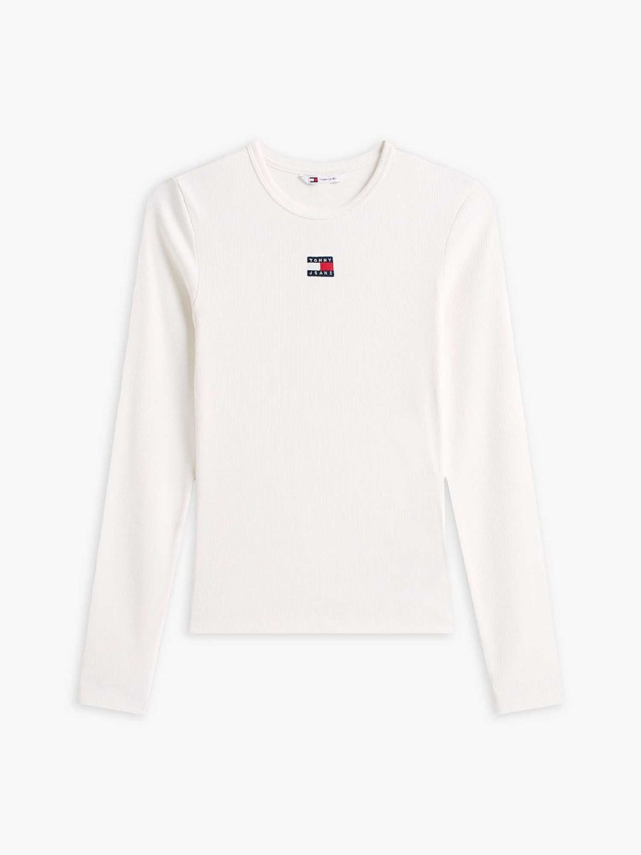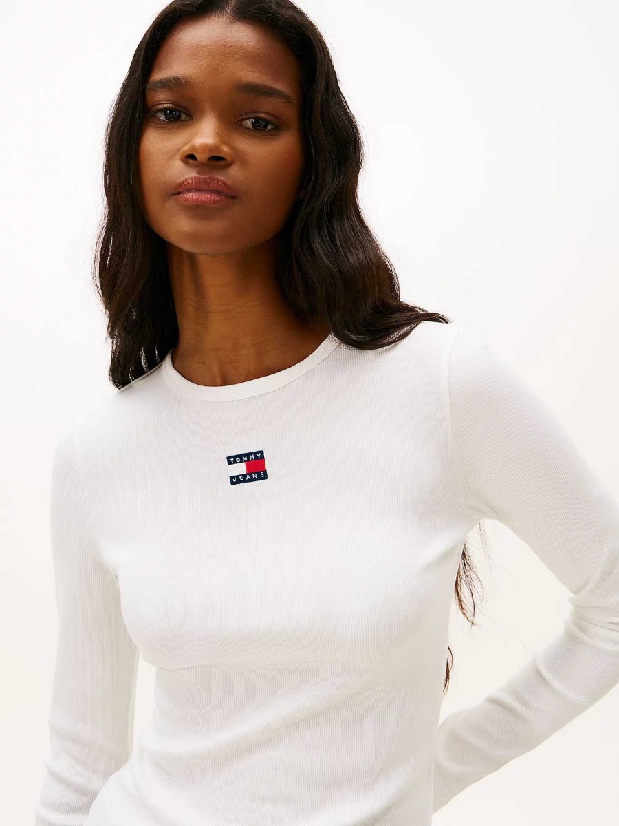 La maglia a maniche lunghe Tommy Jeans Slim da donna della collezione Primavera/Estate è un capo versatile e aderente, ideale per uno stile casual urbano. La lavorazione a costine valorizza la silhouette e aggiunge un tocco distintivo al look, completato dal badge Tommy sul petto.