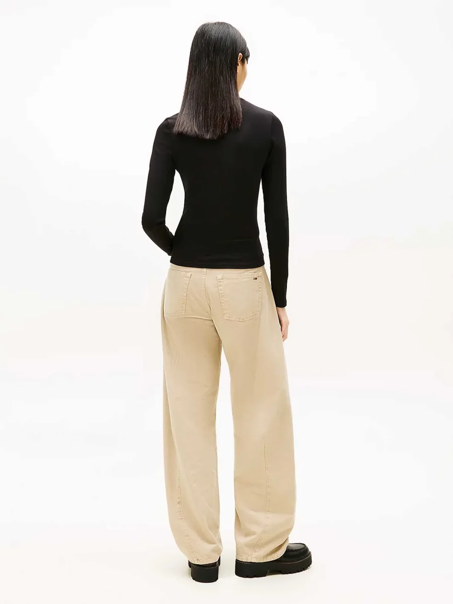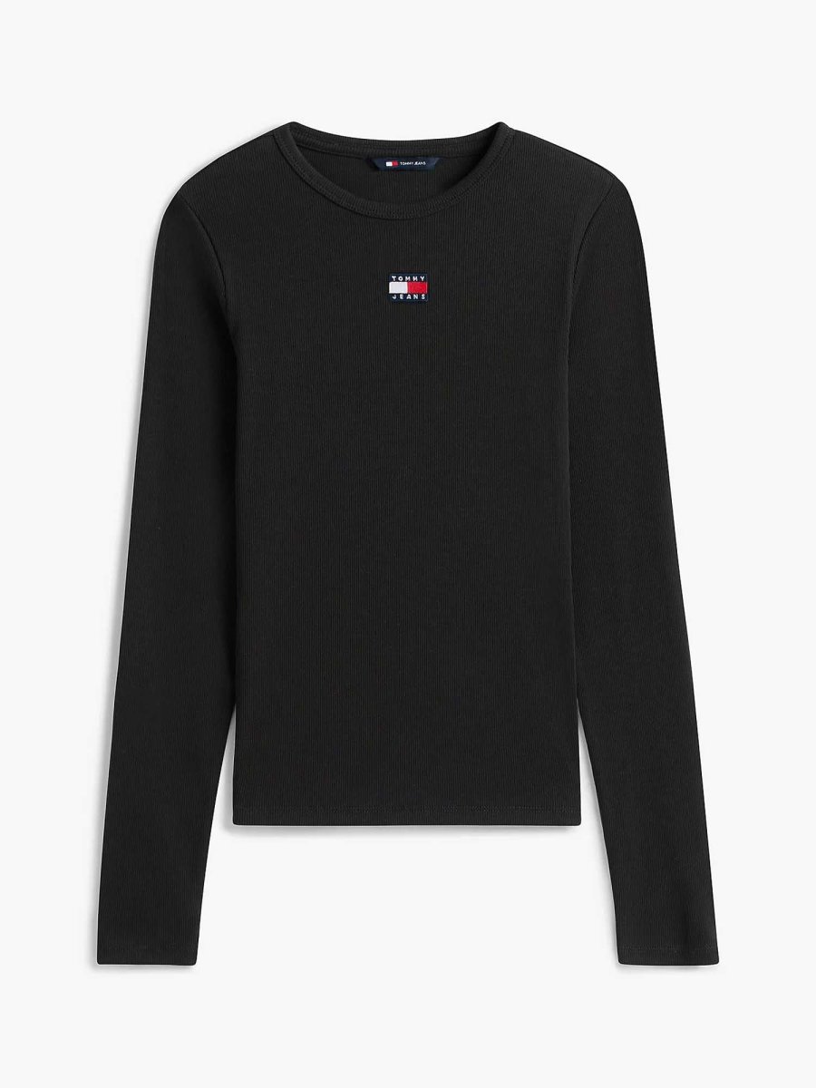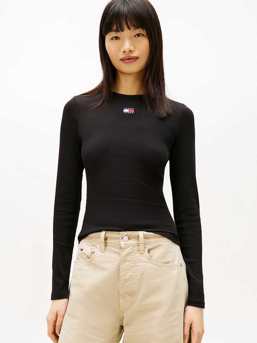 La maglia a maniche lunghe Tommy Jeans Slim da donna della collezione Primavera/Estate è un capo versatile e aderente, ideale per uno stile casual urbano. La lavorazione a costine valorizza la silhouette e aggiunge un tocco distintivo al look, completato dal badge Tommy sul petto.