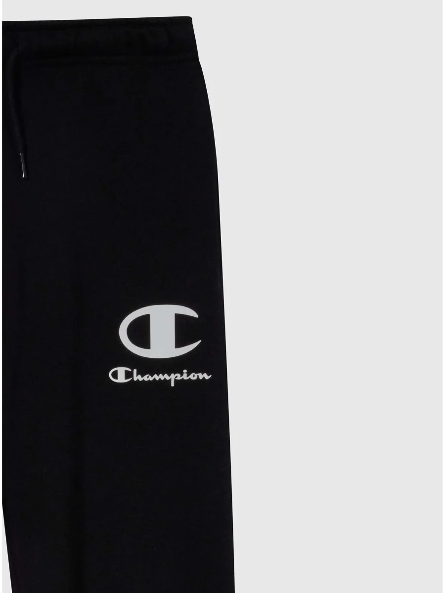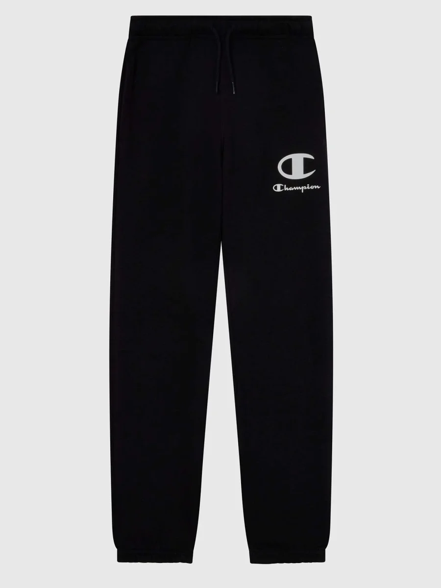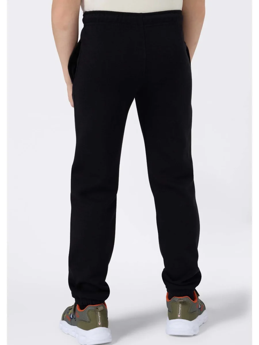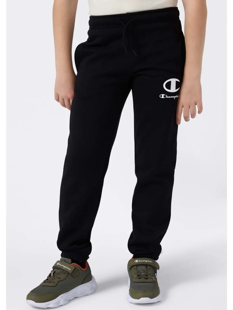 Pantalone jogger junior Champion in cotone felpato nero, ideale per la stagione autunno/inverno. presenta vita elasticizzata con coulisse, due tasche anteriori, logo “c” Champion applicato sul fianco e fondo gamba con caviglie elastiche per una vestibilità comoda e sportiva.