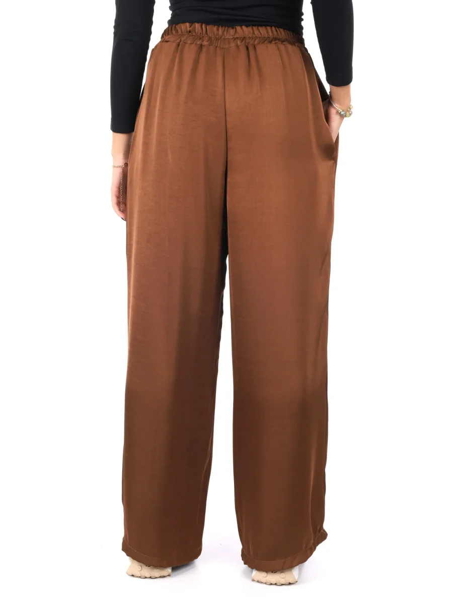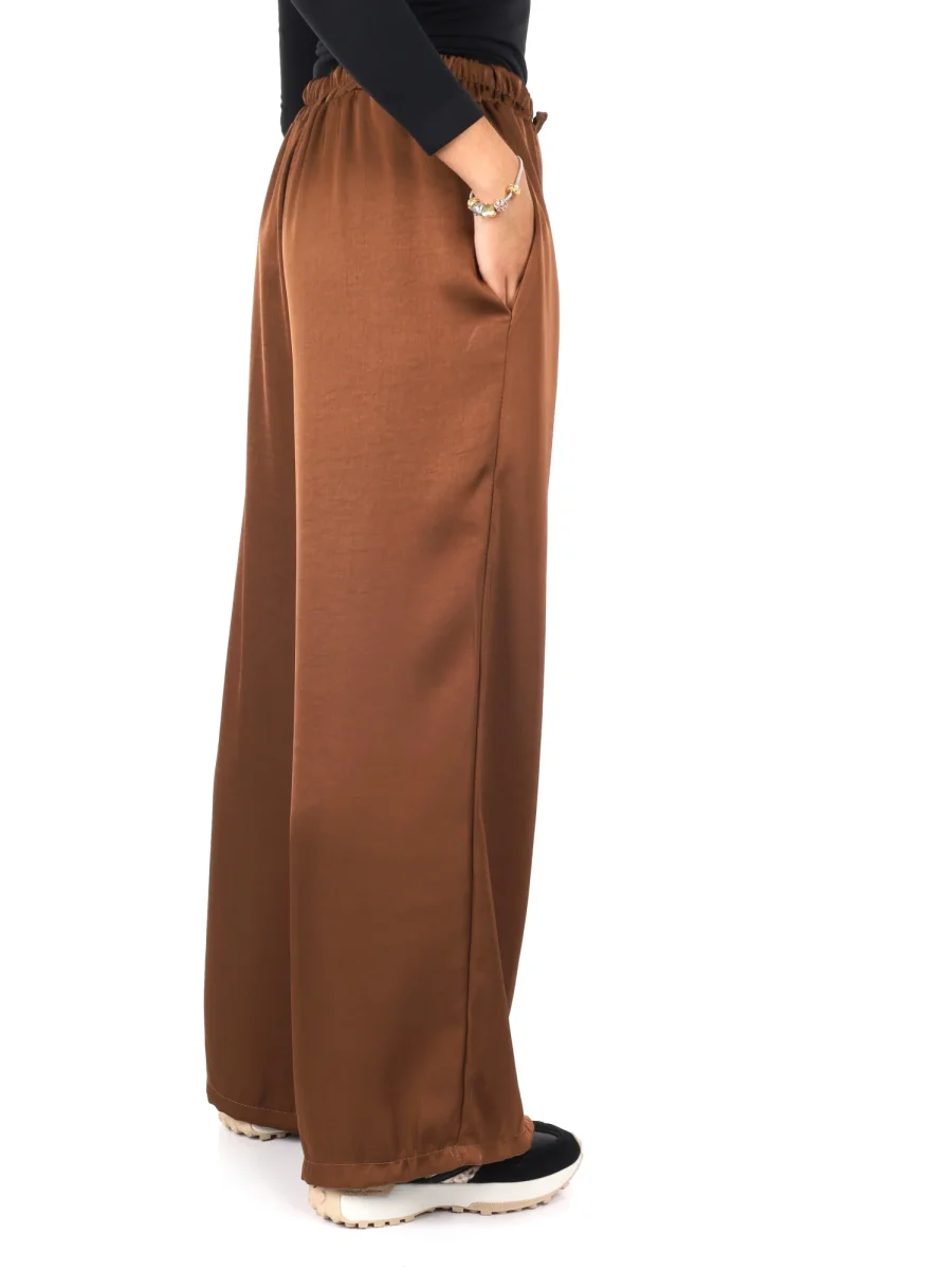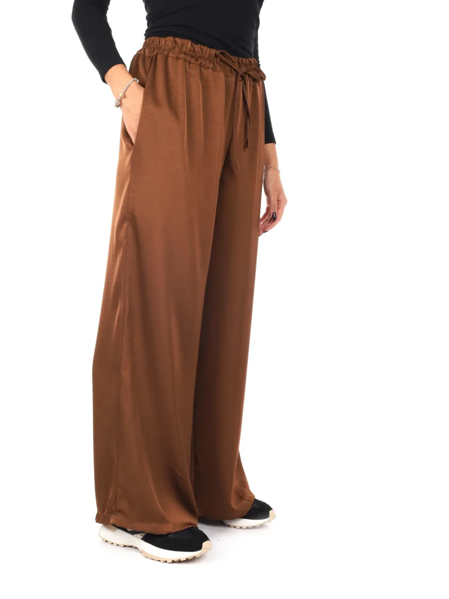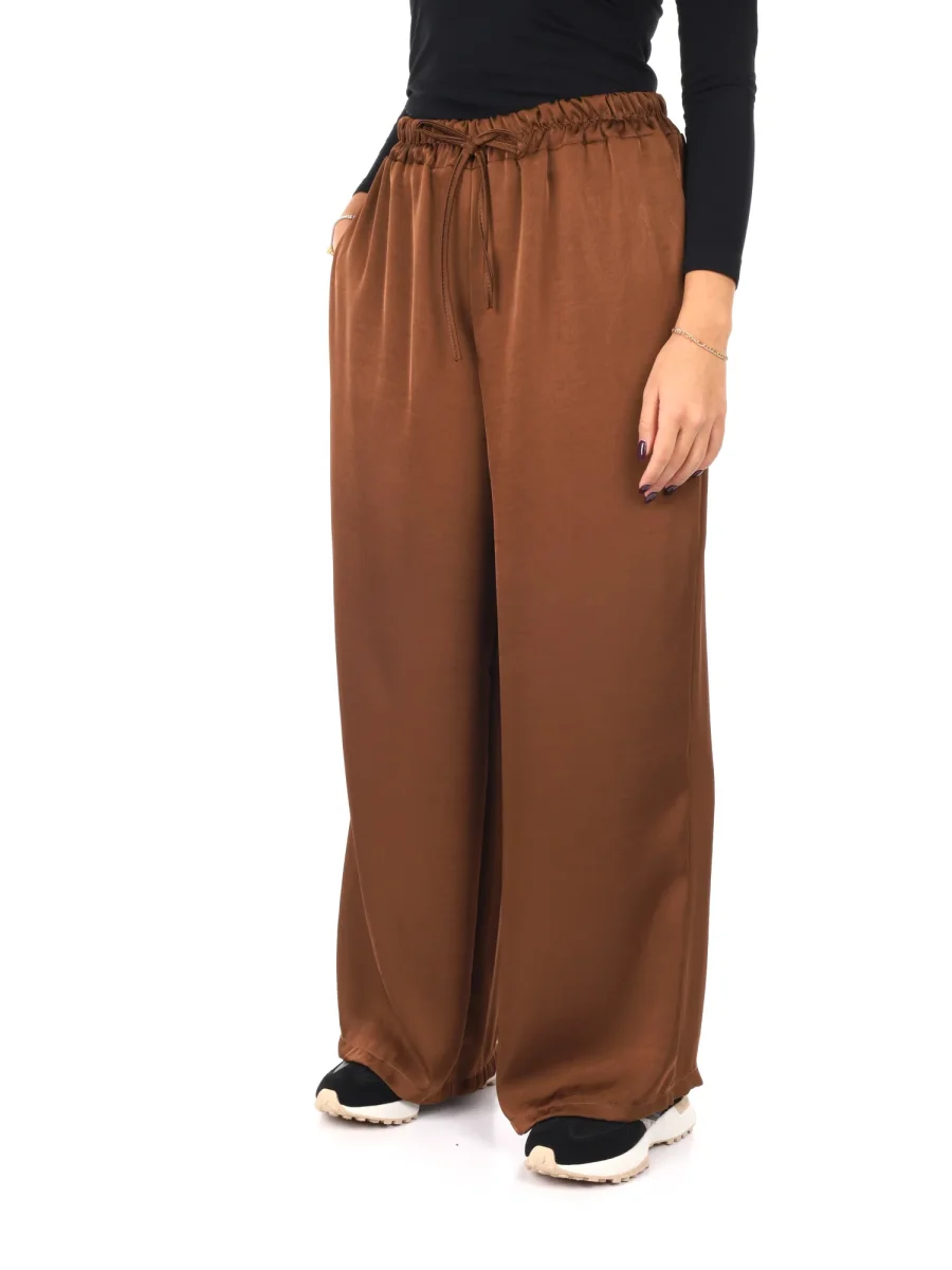 Raffinato e leggero, questo pantalone morbido effetto seta da donna firmato Miss Love, appartenente alla collezione Autunno/Inverno, unisce eleganza e comfort in un capo dallo stile impeccabile. Realizzato in 100% poliestere, vanta una texture liscia e lucente che ricorda la seta, regalando un tocco di sofisticata femminilità. La vestibilità ampia accompagna con morbidezza le linee del corpo, offrendo libertà di movimento e un look fluido e raffinato.