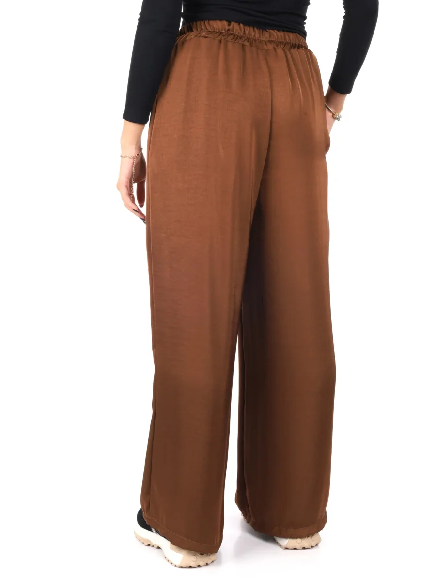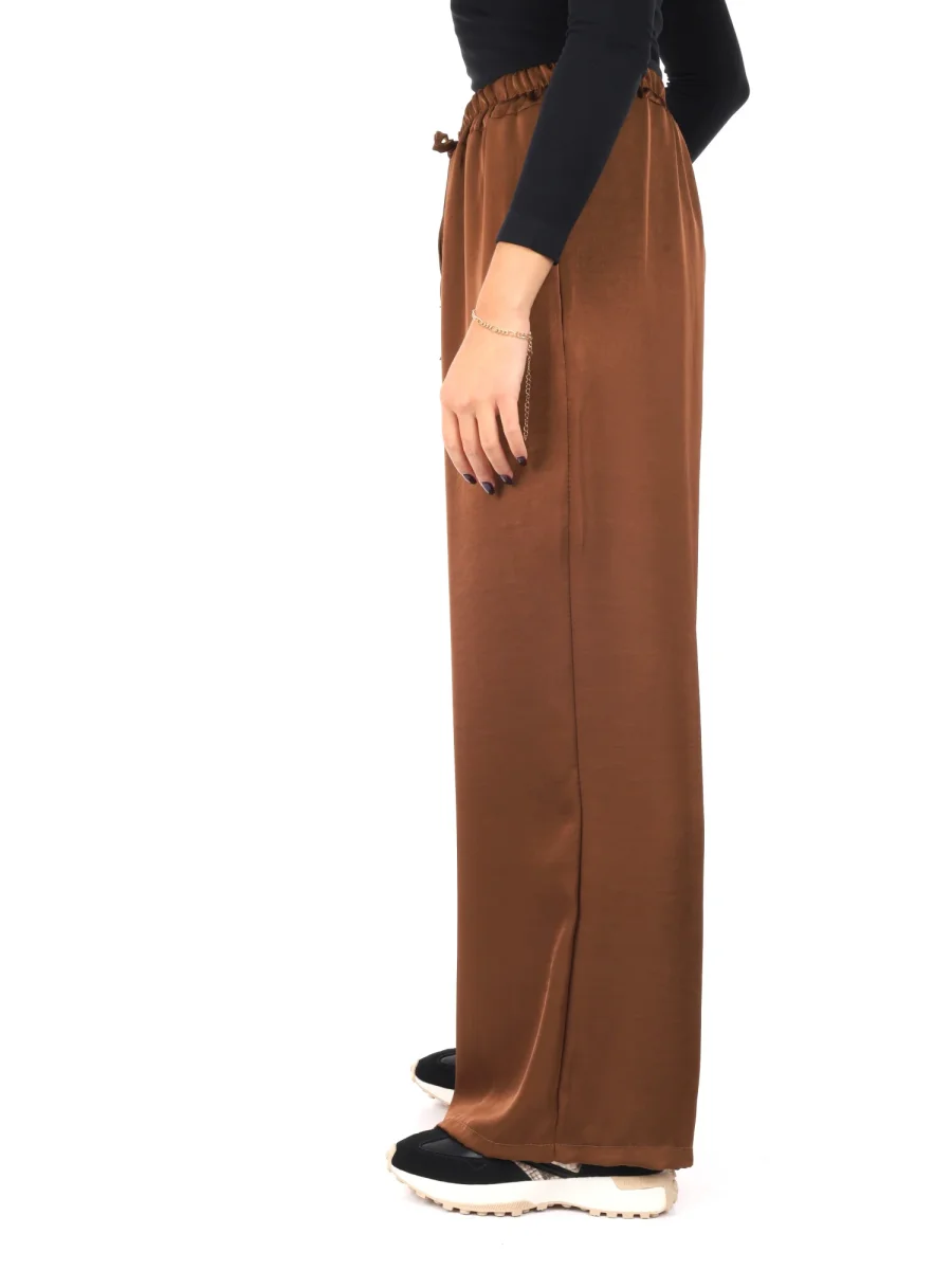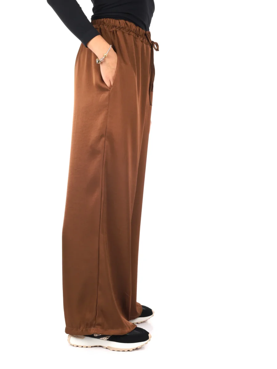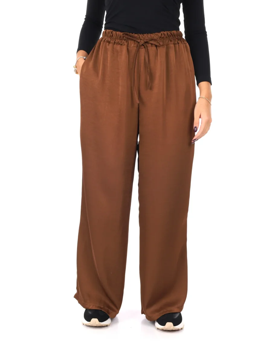 Raffinato e leggero, questo pantalone morbido effetto seta da donna firmato Miss Love, appartenente alla collezione Autunno/Inverno, unisce eleganza e comfort in un capo dallo stile impeccabile. Realizzato in 100% poliestere, vanta una texture liscia e lucente che ricorda la seta, regalando un tocco di sofisticata femminilità. La vestibilità ampia accompagna con morbidezza le linee del corpo, offrendo libertà di movimento e un look fluido e raffinato.