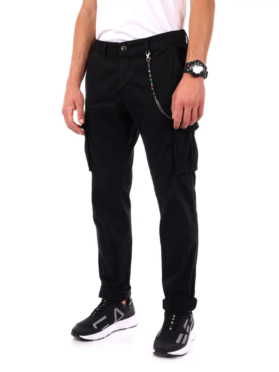 Il design presenta una vestibilità slim con tasconi laterali tipici dello stile cargo, chiusura con bottone e zip, tasche laterali oblique e tasche posteriori con patta. I dettagli a contrasto e le cuciture rinforzate valorizzano il carattere deciso del capo, rendendolo perfetto per il tempo libero o per outfit streetwear contemporanei.