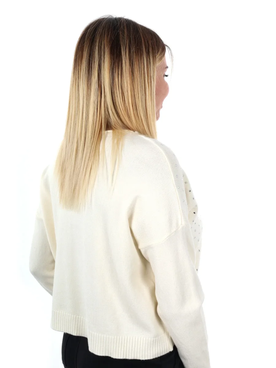 Brilla con stile con il pullover da donna Miss Love, un capo iconico della collezione Autunno/Inverno. Realizzato in un delicato mix di nylon e viscosa, avvolge con morbidezza garantendo una vestibilità regular fit confortevole e versatile. La parte anteriore impreziosita da strass applicati aggiunge un tocco luminoso e sofisticato, trasformando un capo casual in un vero protagonista del tuo outfit. Perfetto da abbinare a jeans, pantaloni palazzo o gonne, questo pullover unisce comfort e glamour per look sempre moderni e raffinati.
