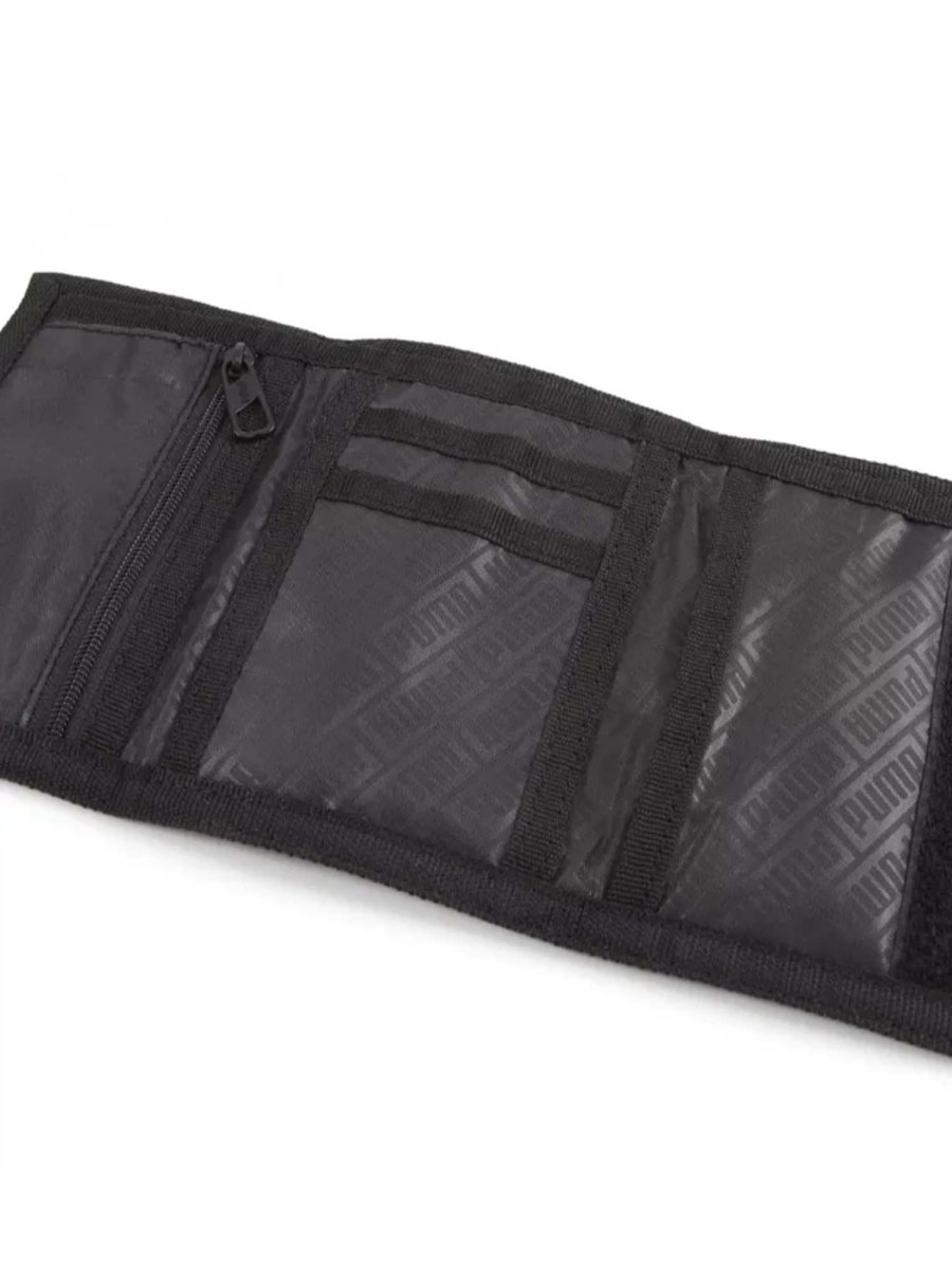 Portafoglio unisex in tessuto firmato Puma, impreziosito da stampa logo gommato a contrasto. Presenta chiusura a velcro con interno suddiviso in un maxi scomparto per banconote, 3 porta carte, tasca porta monete con chiusura a zip.