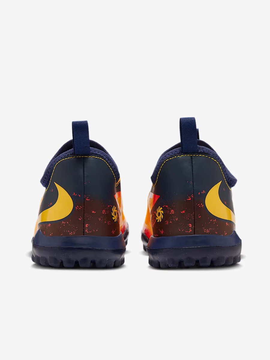 La suola in gomma è progettata per offrire trazione affidabile su campi in erba sintetica, permettendo movimenti rapidi e cambi di direzione senza perdere stabilità. Il profilo basso e la struttura flessibile rendono la scarpa estremamente reattiva, perfetta per accompagnare ogni scatto e ogni azione d’attacco. Il look audace, con colori vivaci e dettagli ispirati a Haaland, aggiunge un tocco di grinta inconfondibile, trasformando ogni partita in un’occasione per dominare il gioco.