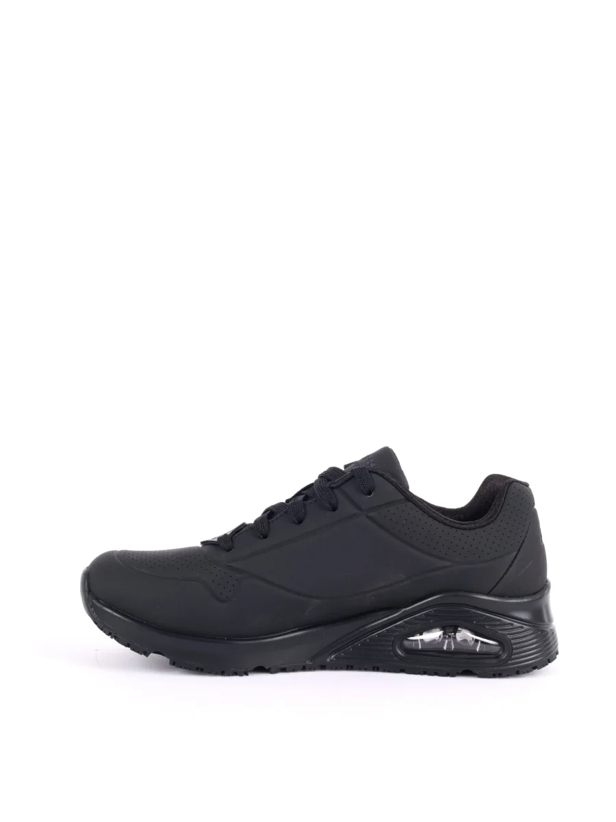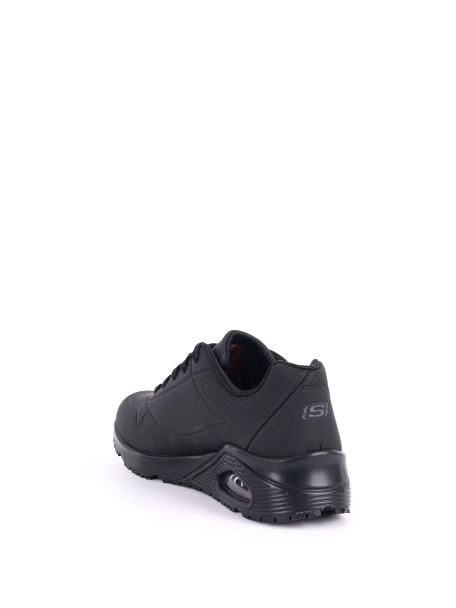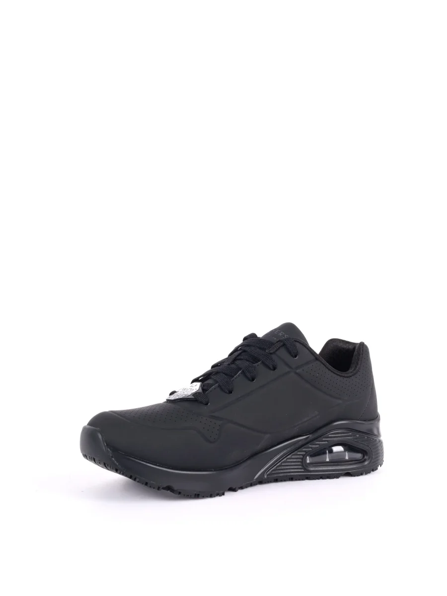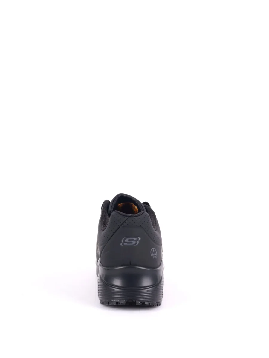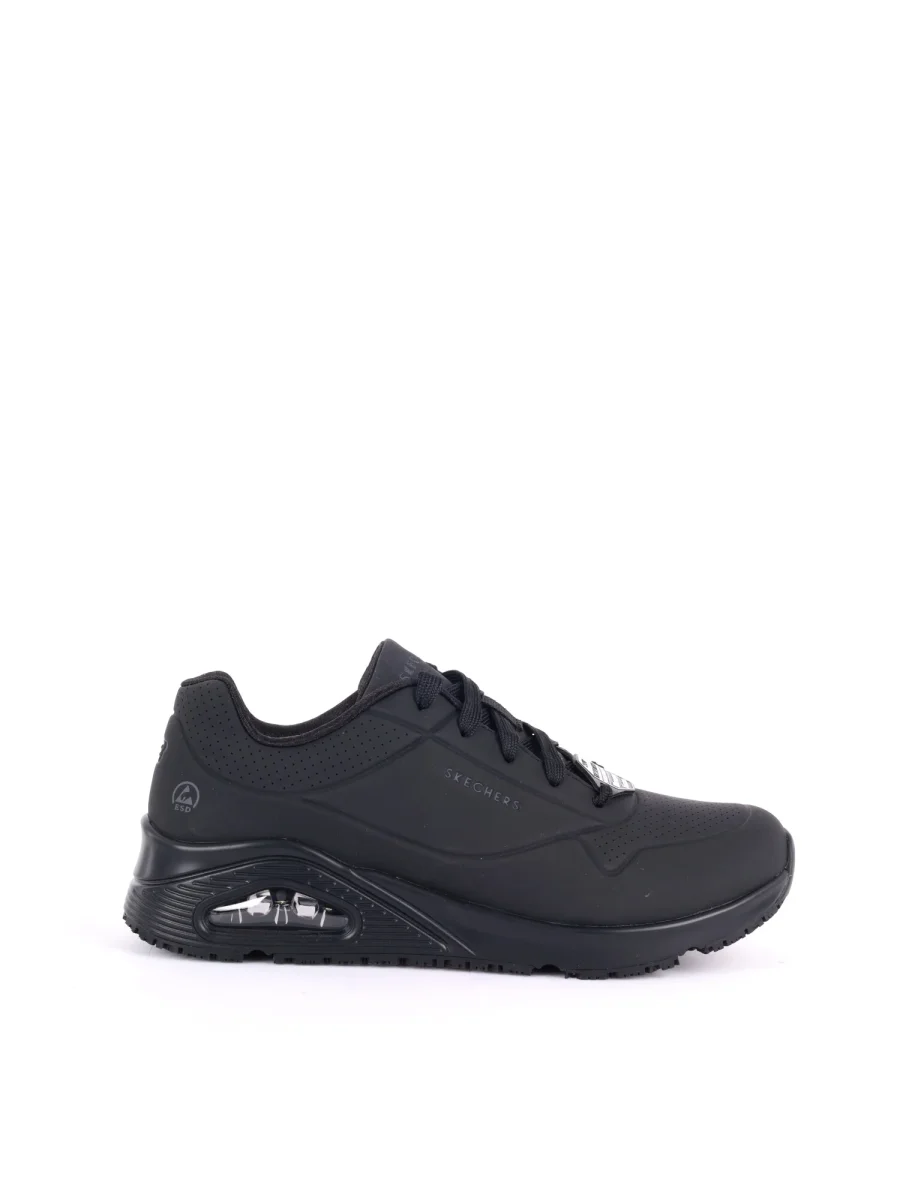 Comfort, stile e sicurezza si uniscono perfettamente nella SKECHERS Work™: Uno SR – Sutal. Questo modello da donna, ampio e allacciato, ideale per l’uso lavorativo, presenta una tomaia sportiva traforata realizzata in materiale tecnico liscio, che garantisce traspirabilità e un aspetto moderno. La soletta Air Cooled Memory Foam® assicura un comfort immediato e una piacevole ammortizzazione, mentre l’intersuola con tecnologia visibile Skech-Air® dona una sensazione di leggerezza, come camminare sulle nuvole. La suola antiscivolo SRC offre una trazione efficace, resistente a olio e benzina, per una sicurezza ottimale in ambienti di lavoro impegnativi. Inoltre, il design ESD riduce l’accumulo di elettricità statica, proteggendo chi le indossa.