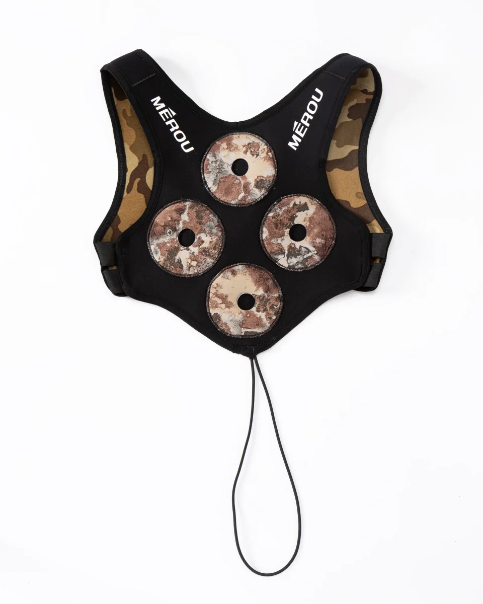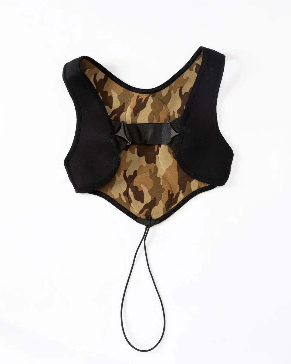 Manufatto in neoprene foderato mimetico con elastico e pomello di fissaggio alla cintura.