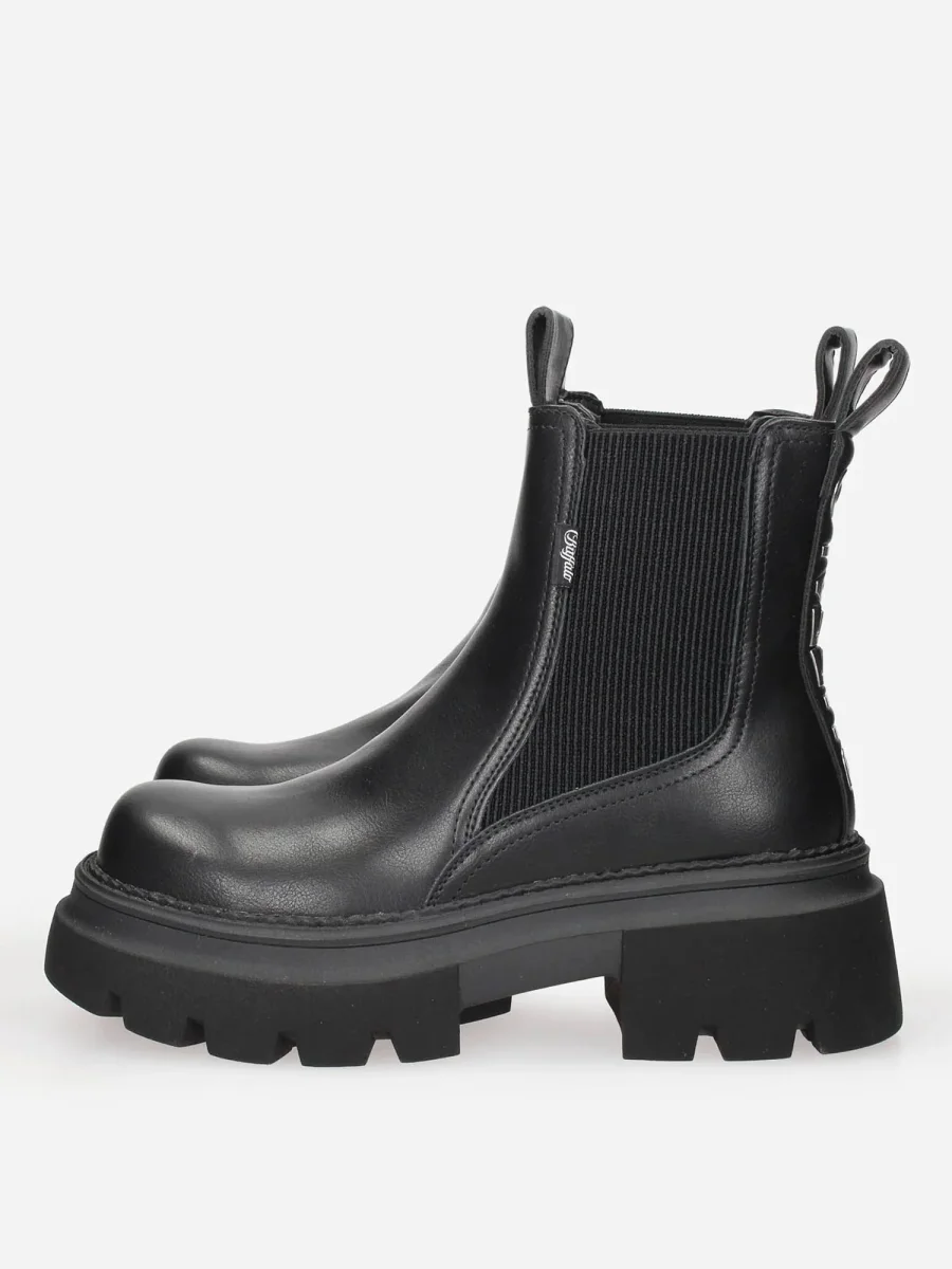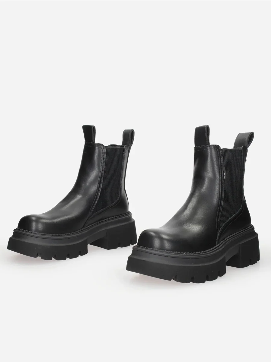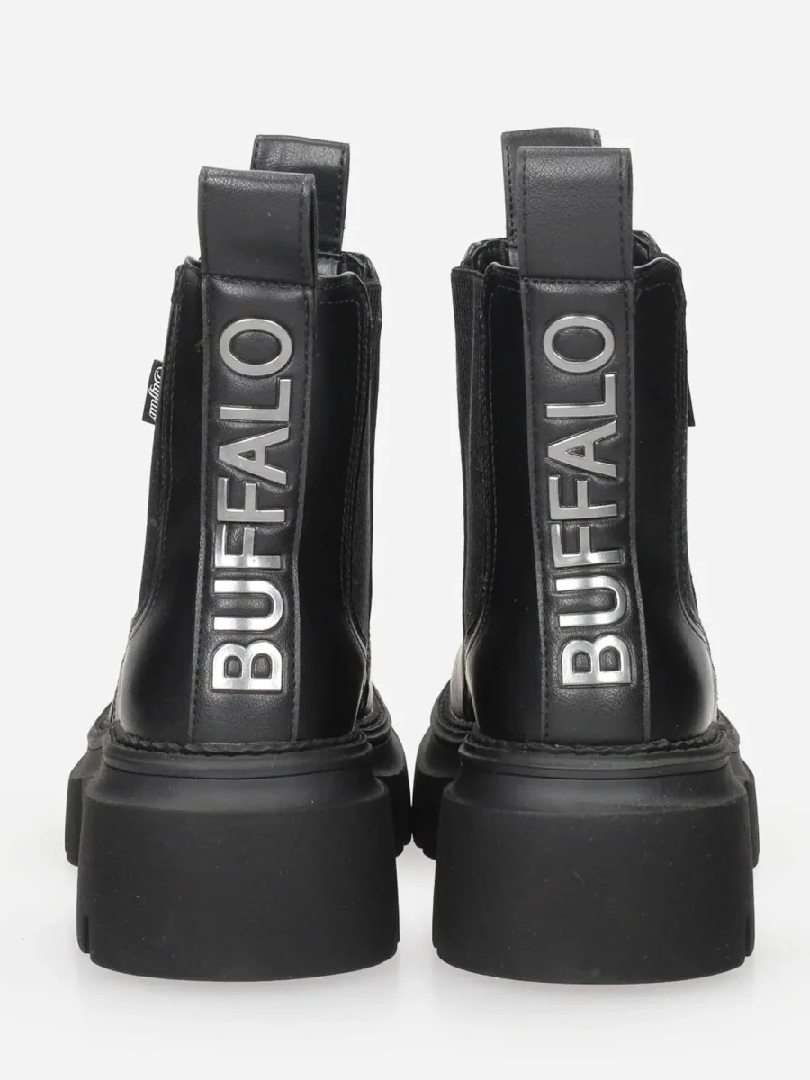 Stivaletto Chelsea da donna firmato Buffalo della collezione Autunno/Inverno, dal design classico e senza tempo, perfetto per completare look eleganti o casual. Realizzato in fintapelle vegana nera effetto vitello, unisce stile e attenzione alla sostenibilità.