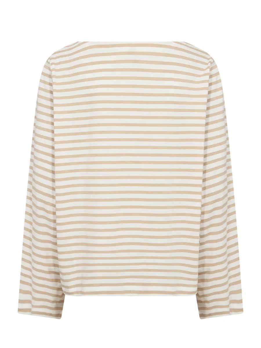 Il design si distingue per le classiche righe orizzontali, la scollatura a barca elegante e le maniche ampie, che donano un tocco moderno e rilassato alla silhouette.