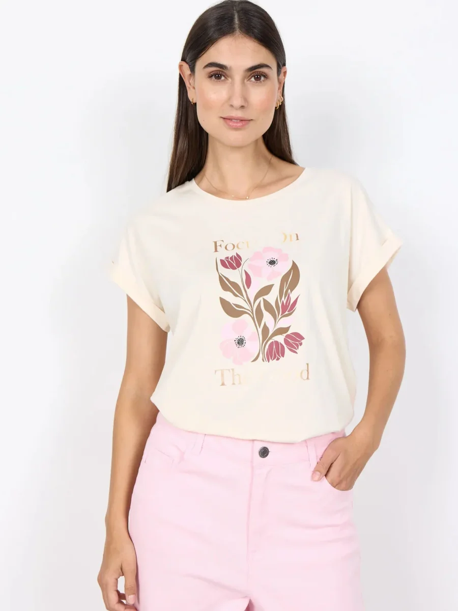 La t-shirt girocollo da donna firmata Soya Concept, della collezione primavera/estate, è un capo casual dallo stile fresco e femminile.