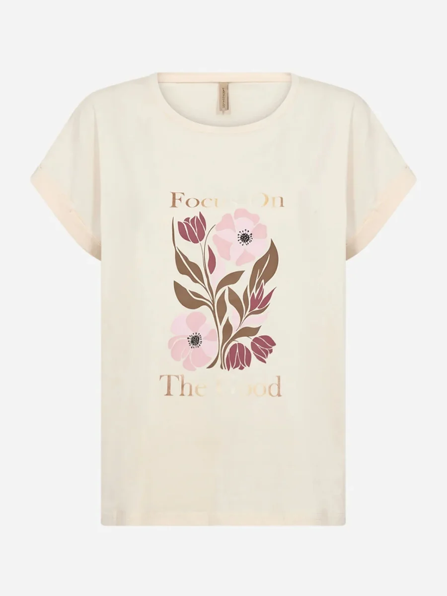 Il design presenta un classico scollo rotondo e maniche corte, impreziositi da una delicata stampa floreale con testo motivazionale sul davanti, che aggiunge un tocco positivo e di tendenza al look.