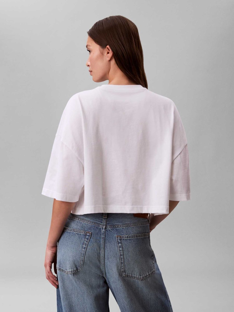 La t-shirt da donna Calvin Klein Jeans Boxy Fit della nuova collezione Primavera/Estate è un capo moderno e di tendenza, perfetto per look casual contemporanei. Realizzata in morbido cotone, garantisce comfort e traspirabilità durante tutta la giornata. Il modello presenta un girocollo classico, maniche corte e una vestibilità boxy, con linea ampia e leggermente squadrata per uno stile rilassato e attuale. Il design è valorizzato dal logo Calvin Klein stampato e ricamato sul petto, che dona un tocco distintivo e ricercato. Versatile e facile da abbinare, è ideale con jeans, pantaloni o gonne per outfit semplici ma di carattere.